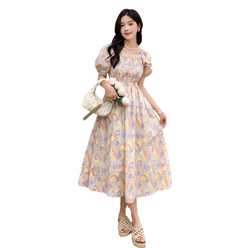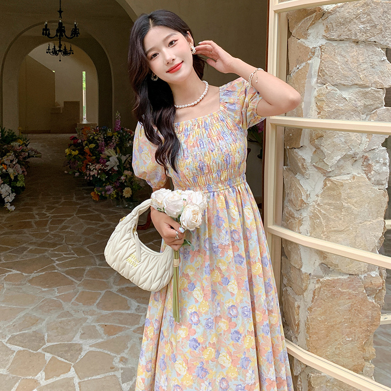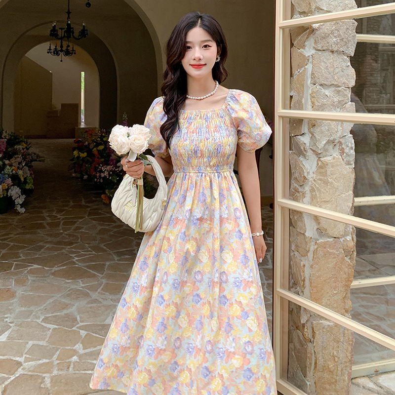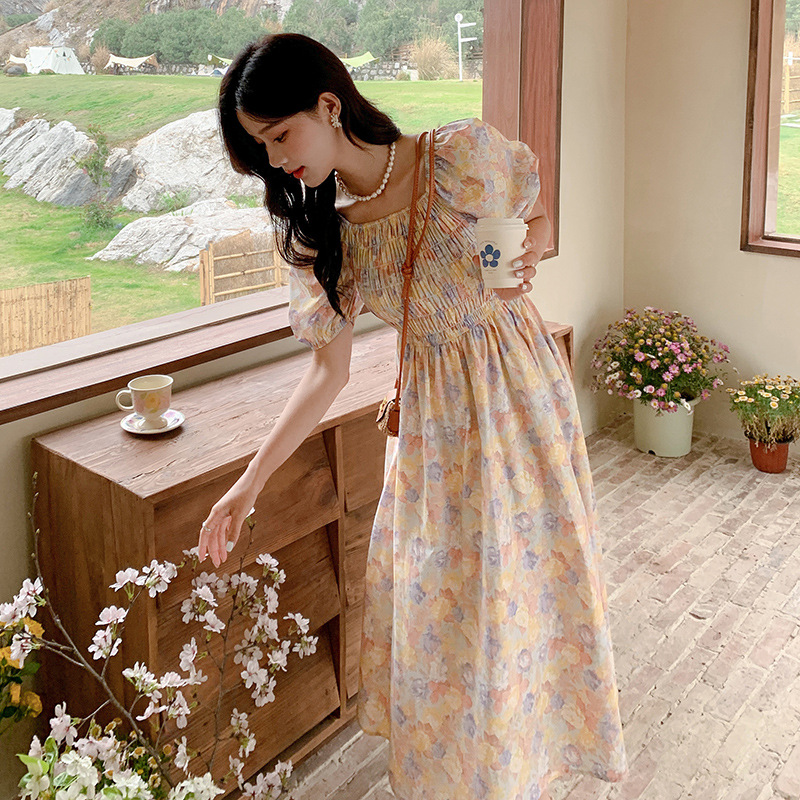 夏法式桔梗棉印花长款松紧腰连衣裙方领泡泡袖显瘦A字碎花裙