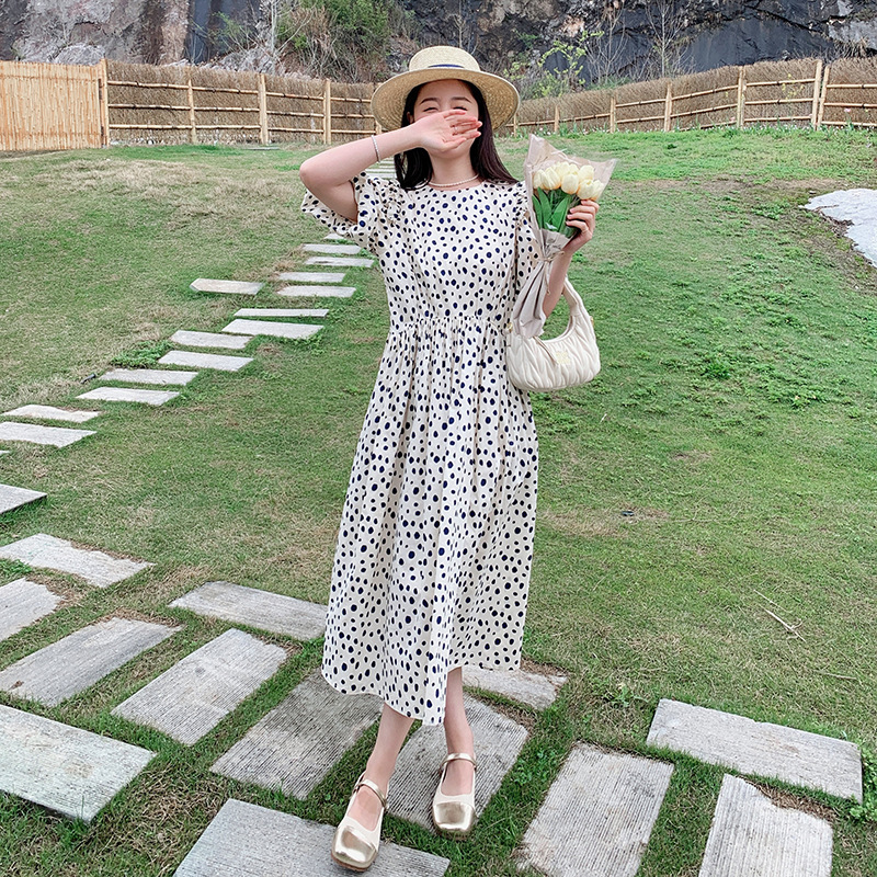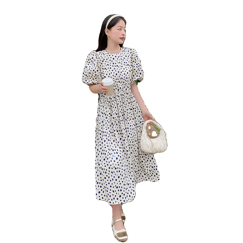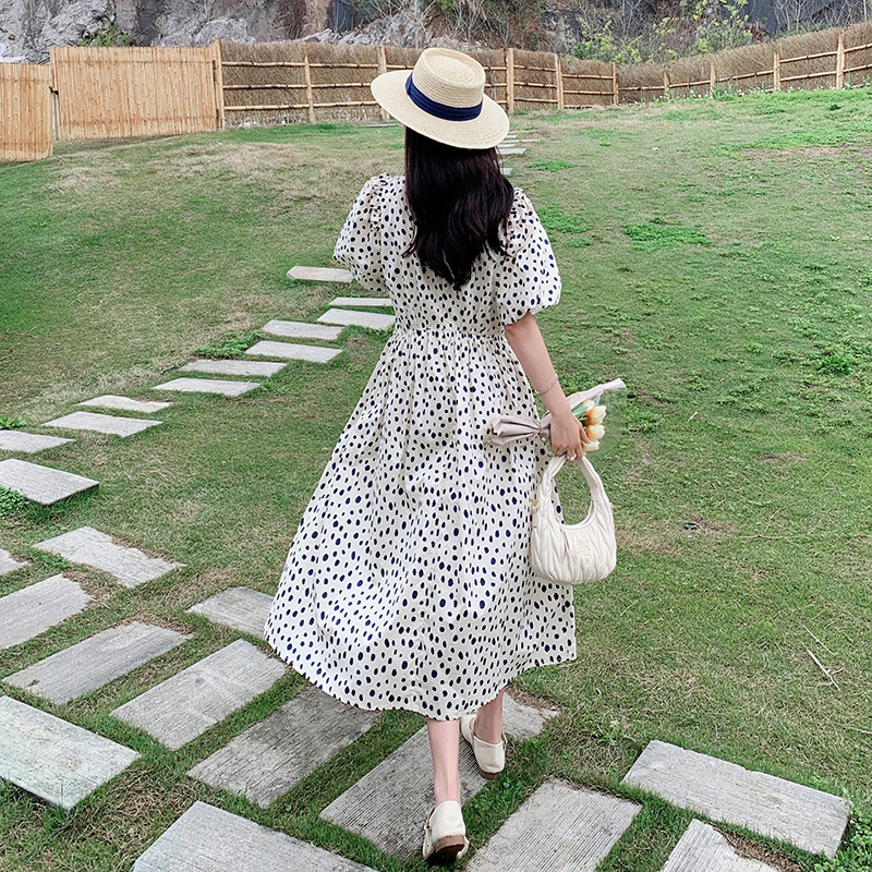 法式减龄波点少女裙个性拼色宽松显瘦落肩泡泡袖A字短夏款连衣裙