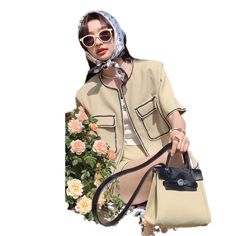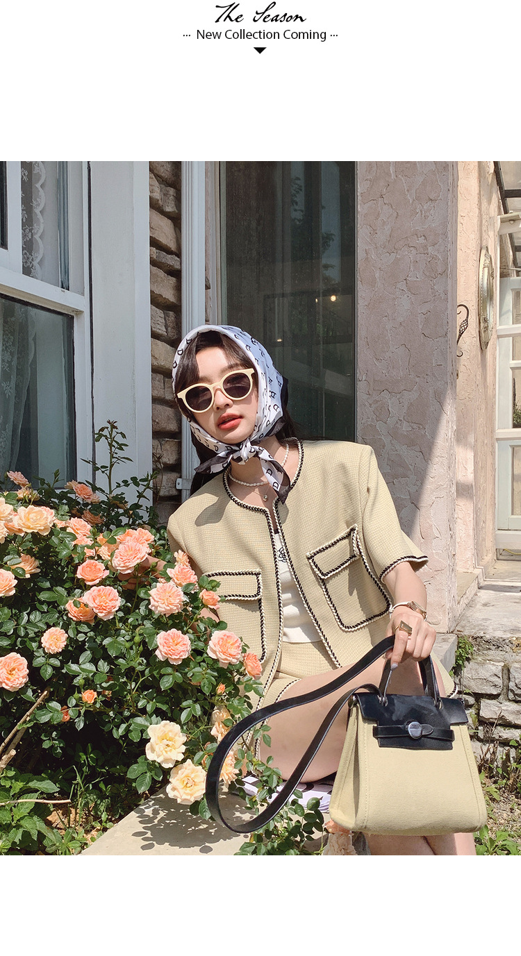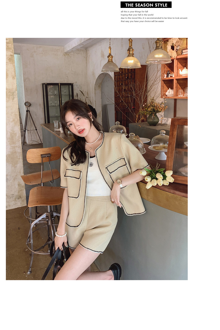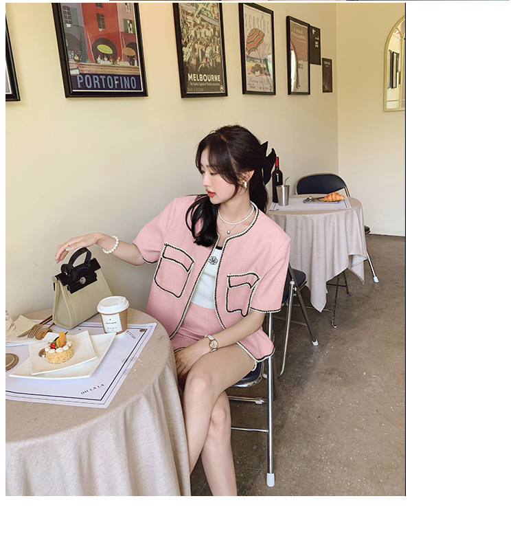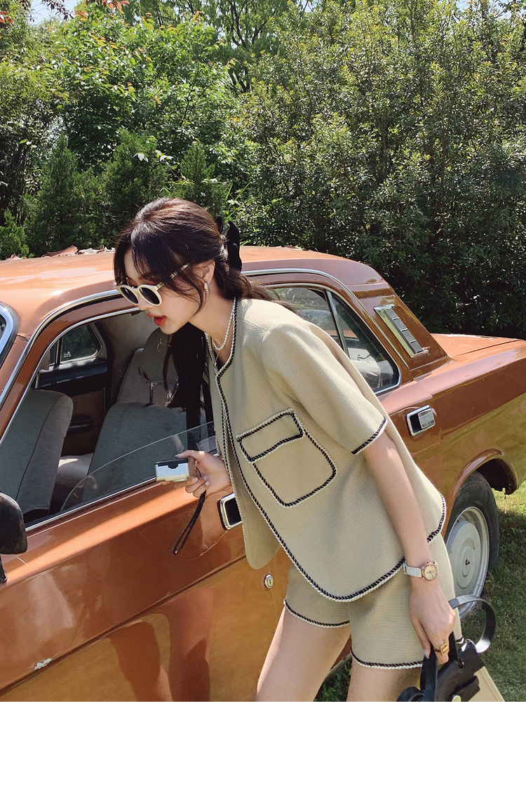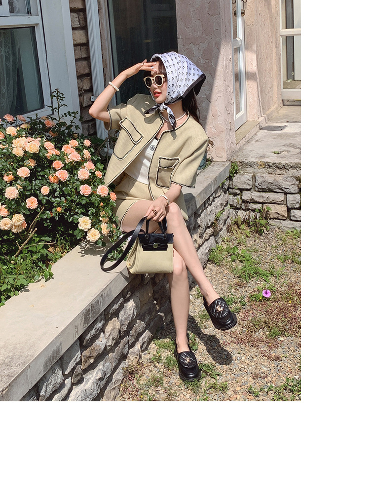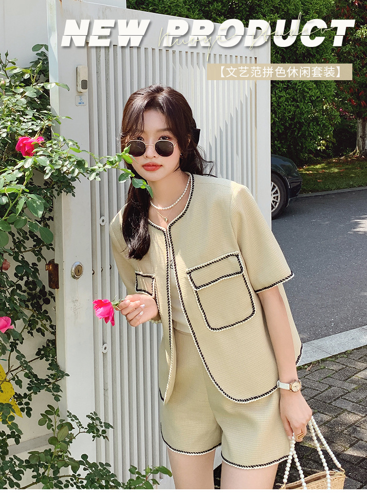 小香风文艺范时尚拼色休闲套装女简约圆领口袋包边高腰短款两件套
