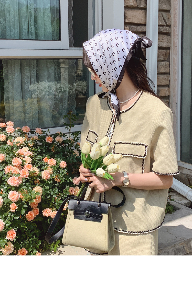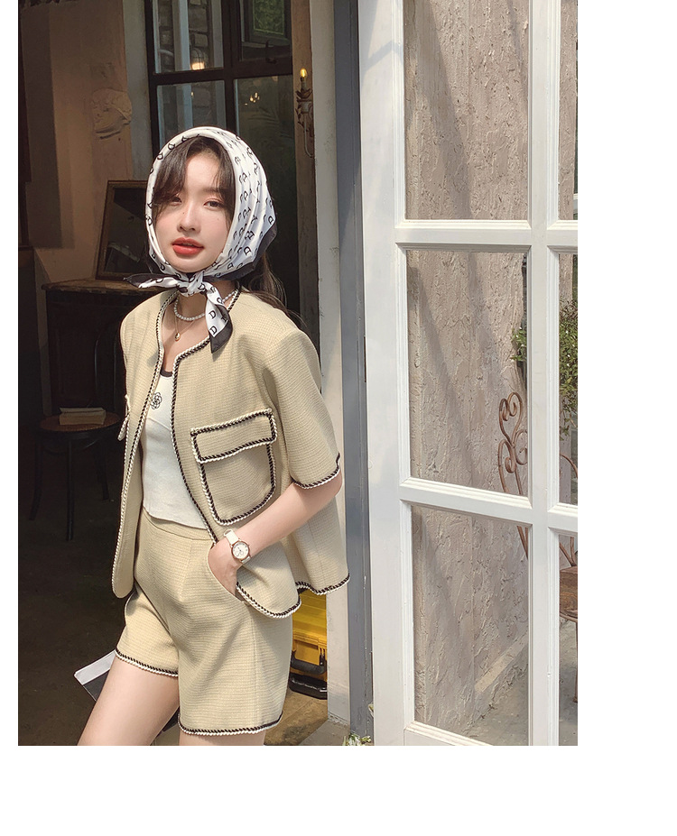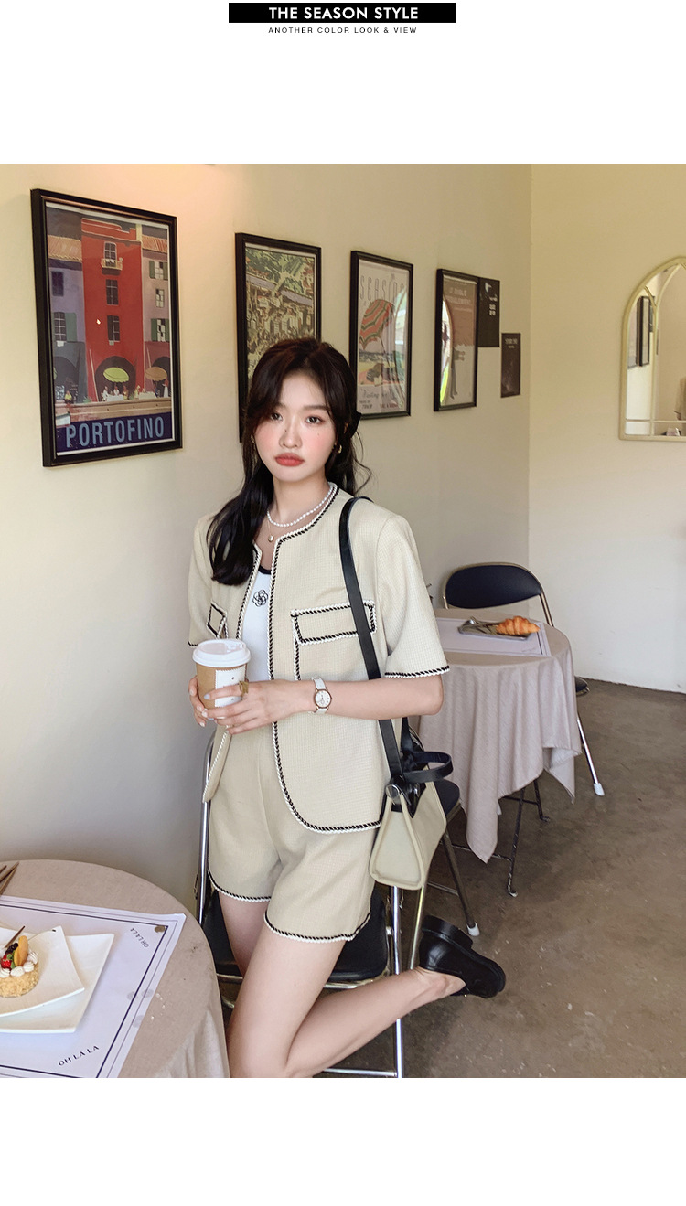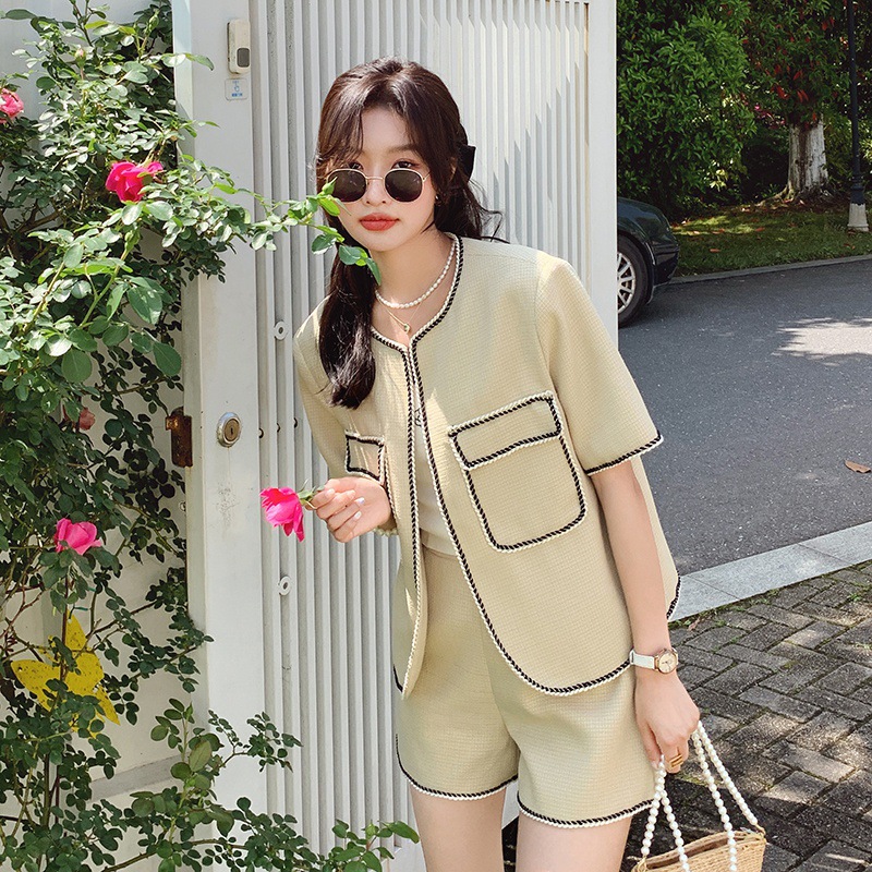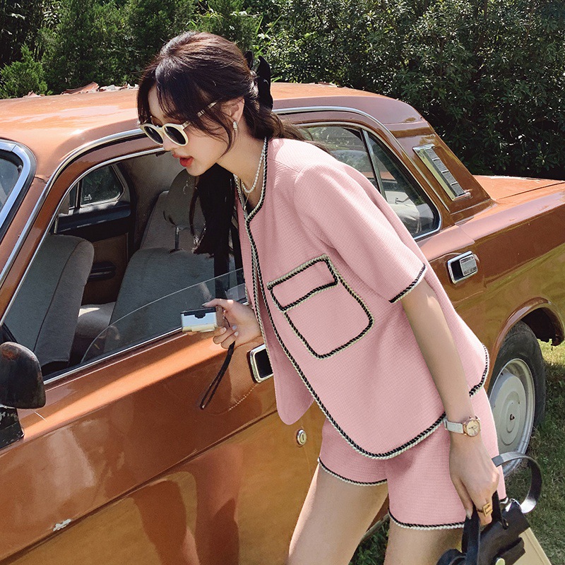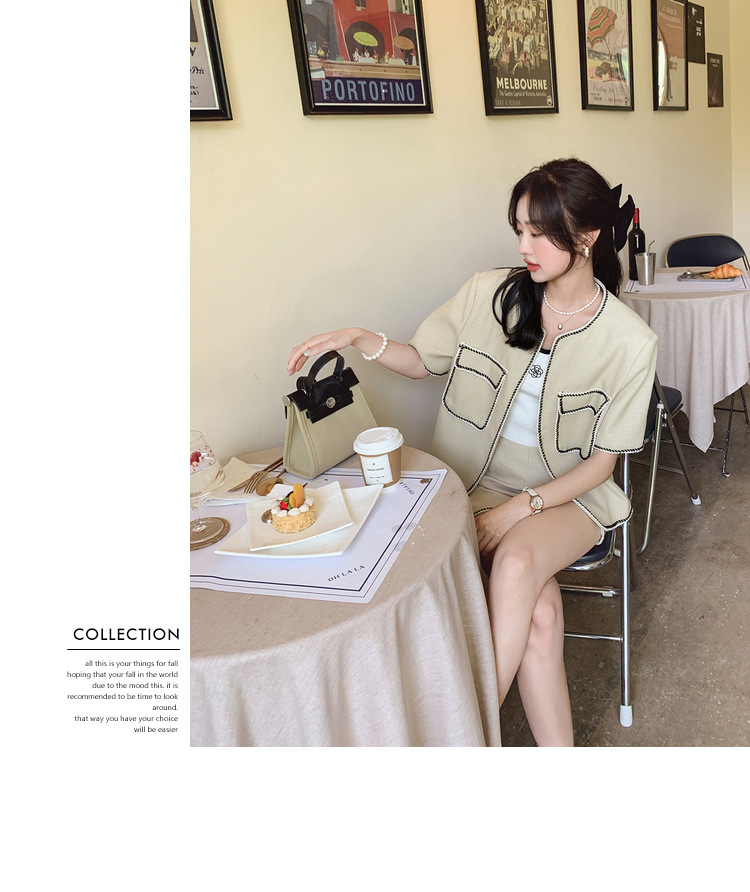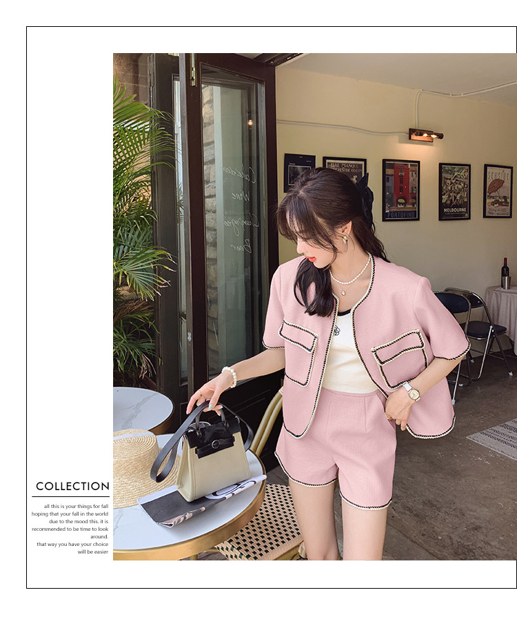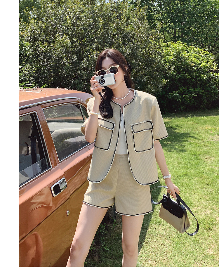 小香风文艺范时尚拼色休闲套装女简约圆领口袋包边高腰短款两件套