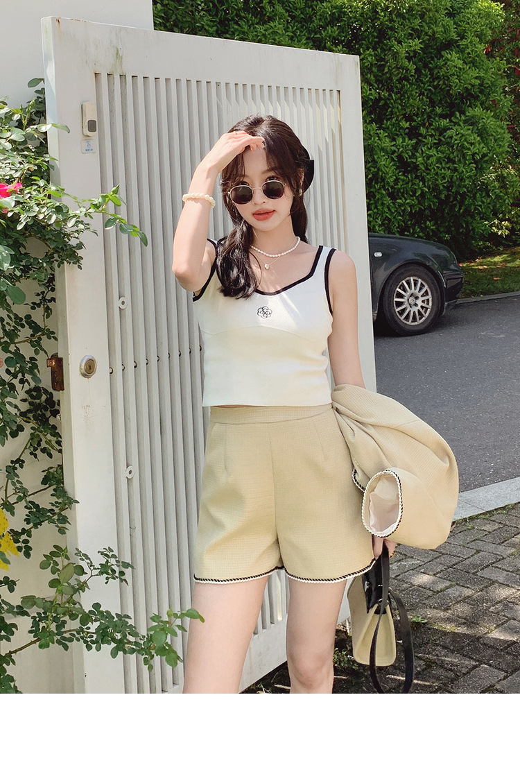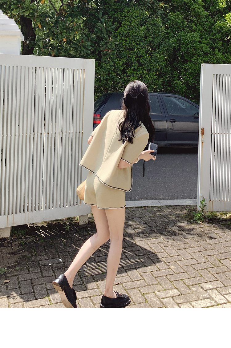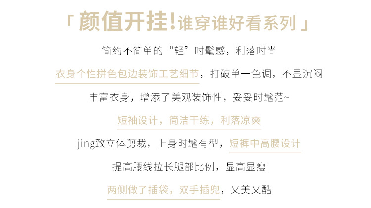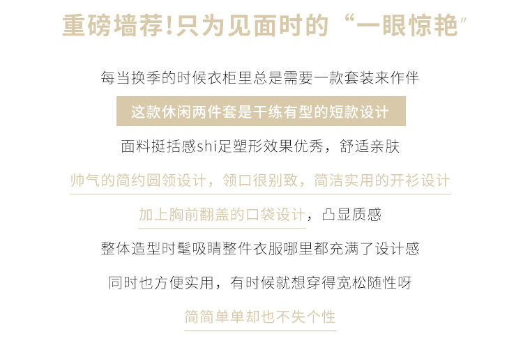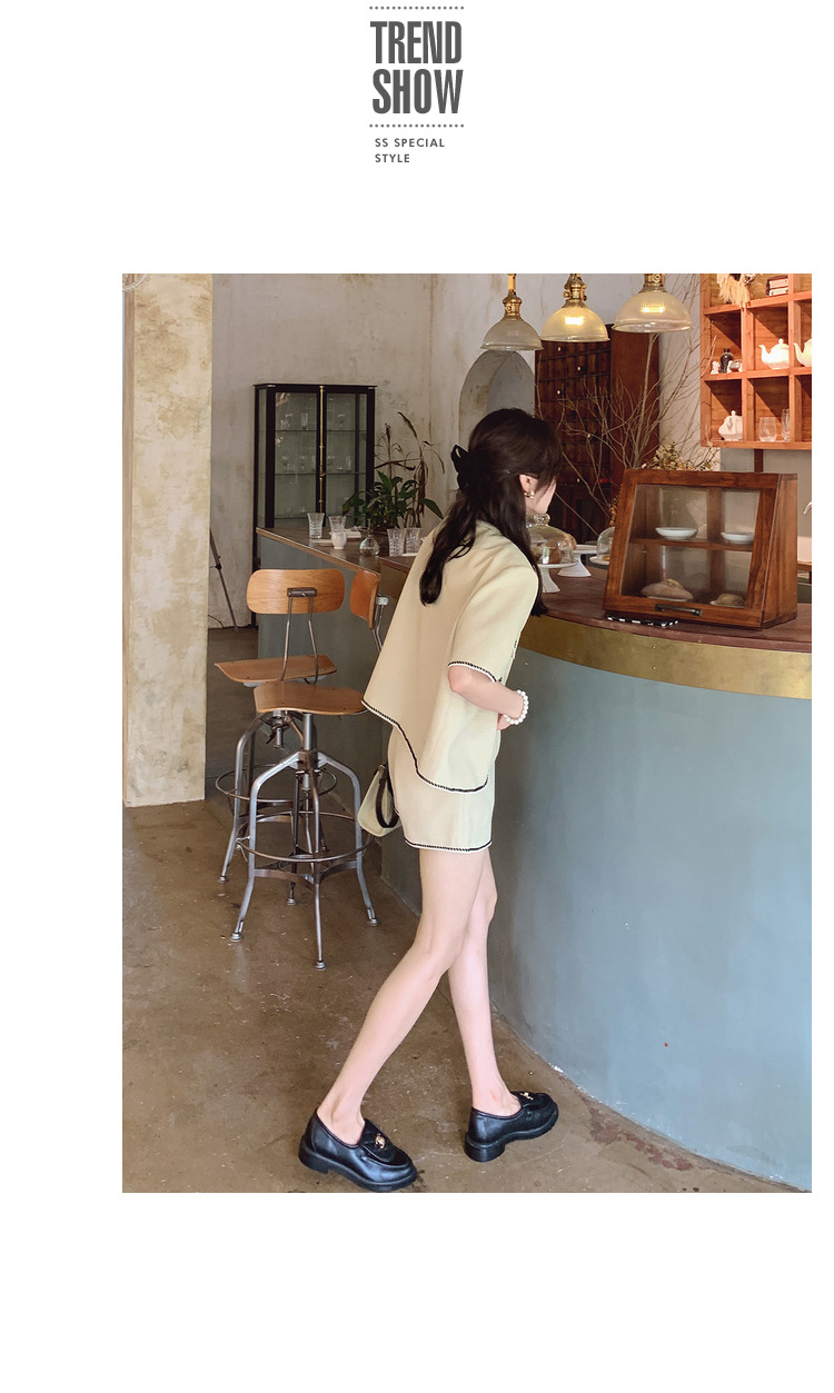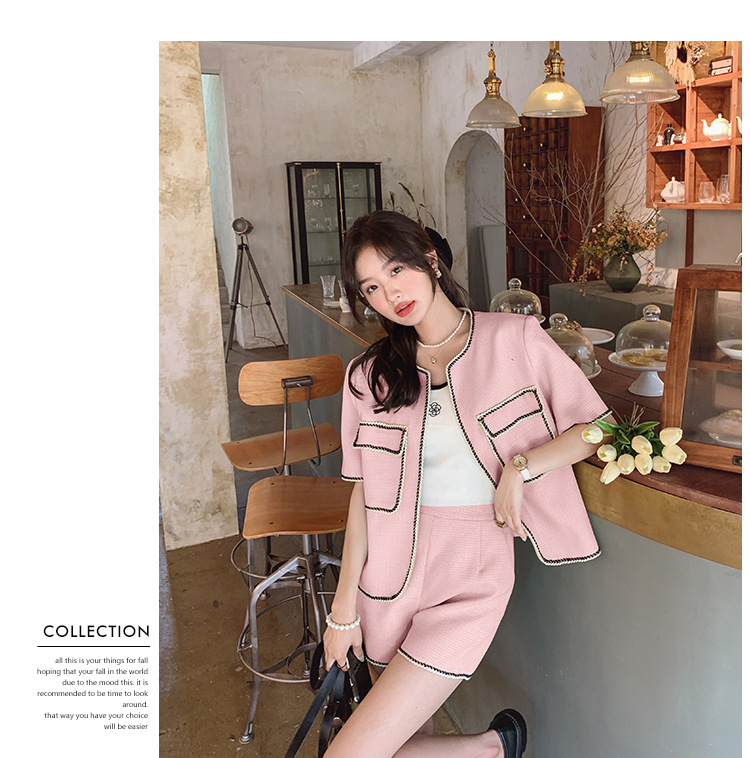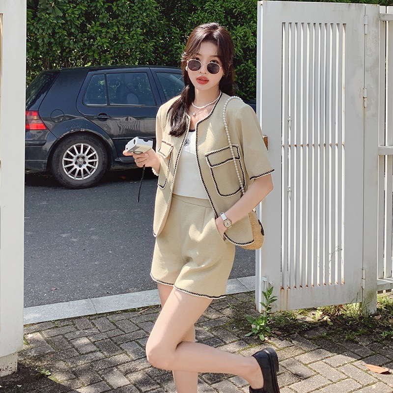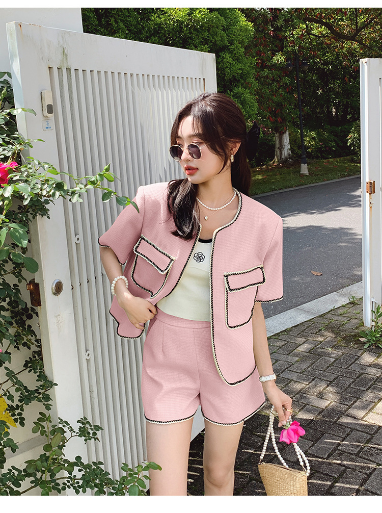 小香风文艺范时尚拼色休闲套装女简约圆领口袋包边高腰短款两件套