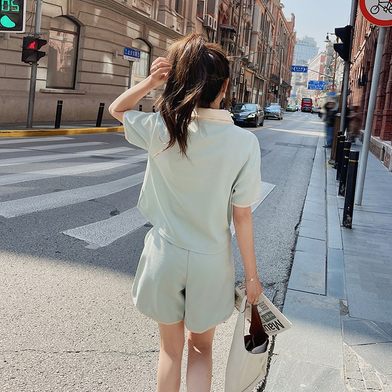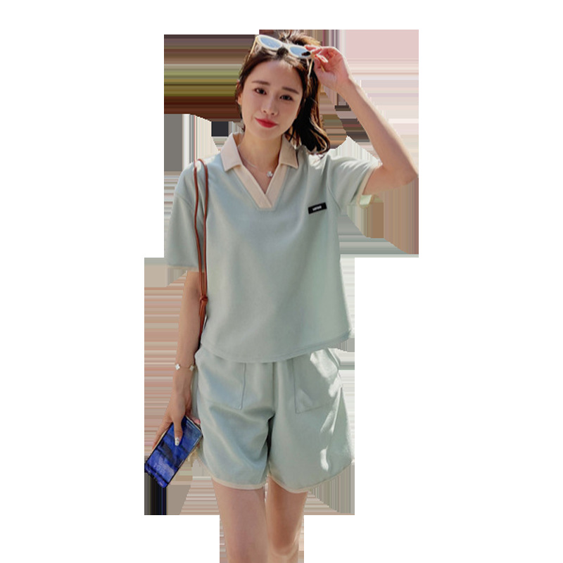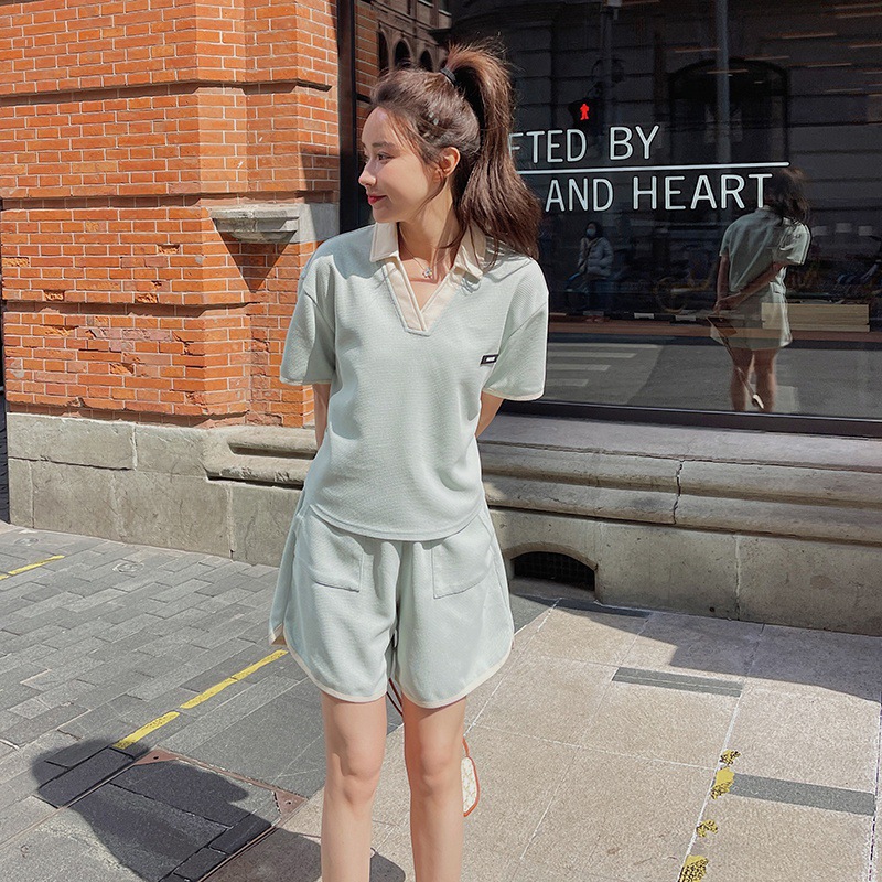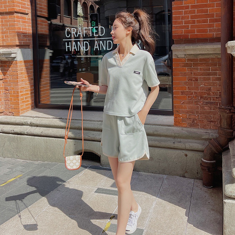 华夫格运动休闲套装时髦街头撞色翻领拼接宽松夏季新品短款两件套