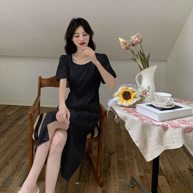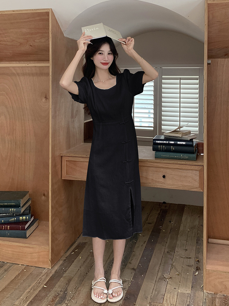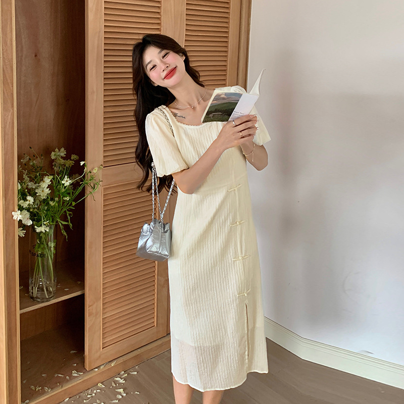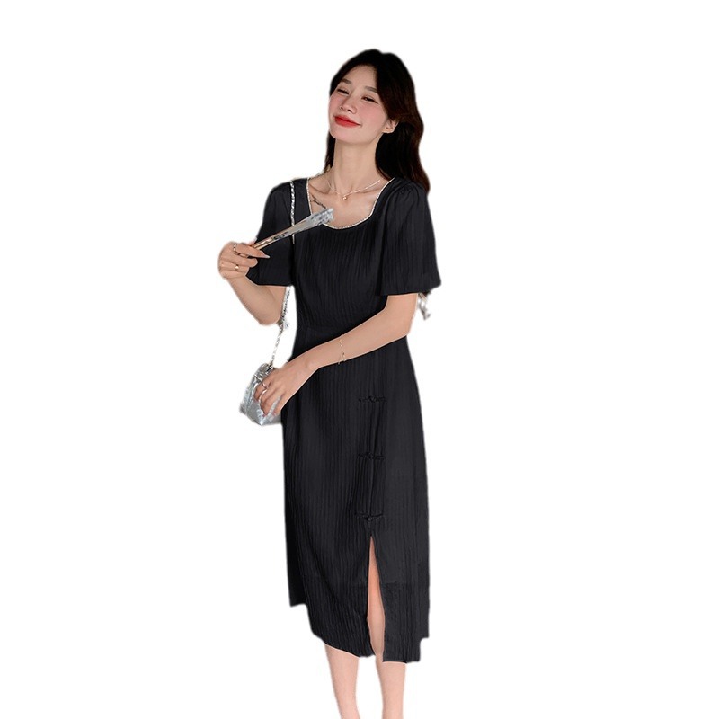 中式复古温柔风方领盘扣旗袍式开叉提花连衣裙简约休闲仙女初恋裙