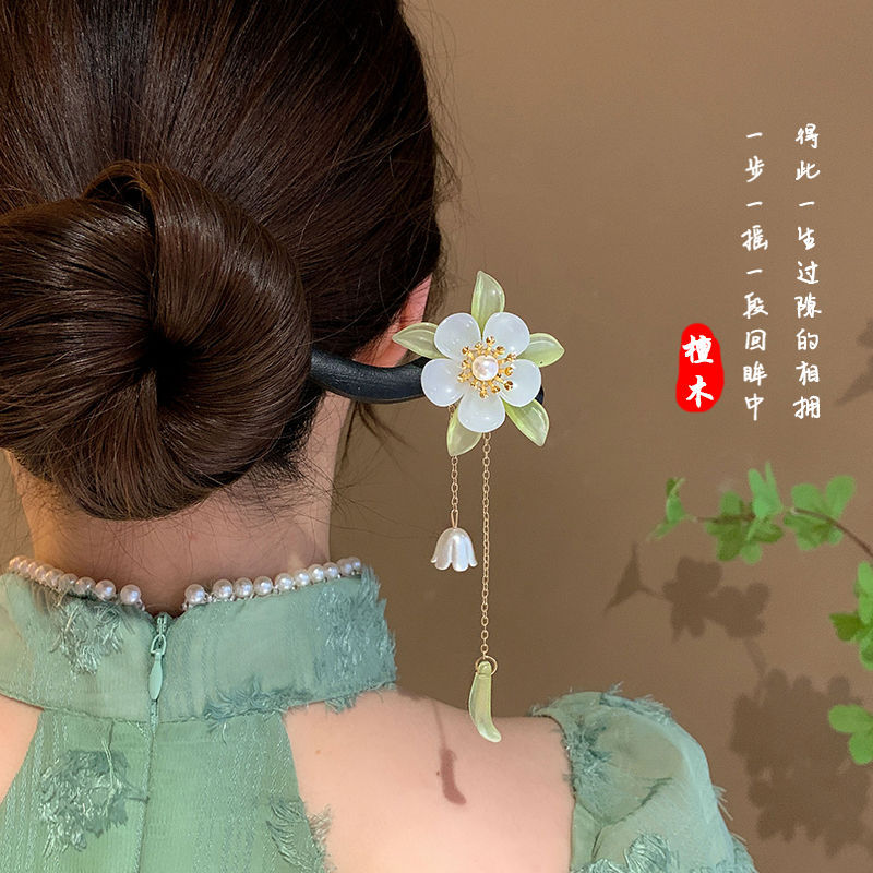 花朵流苏发簪女古风汉服旗袍木质簪子后脑勺盘发发钗步摇头饰