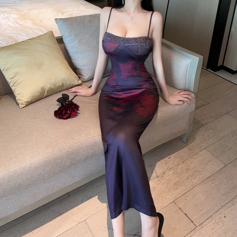 性感辣妹夜店印花气质吊带修身包臀长裙礼服连衣裙女