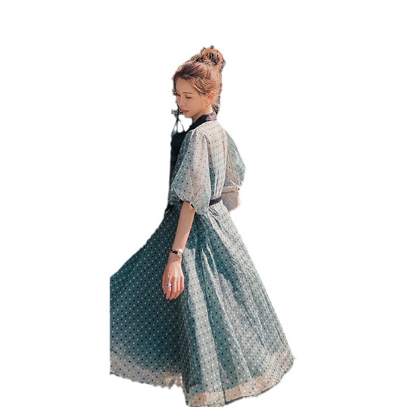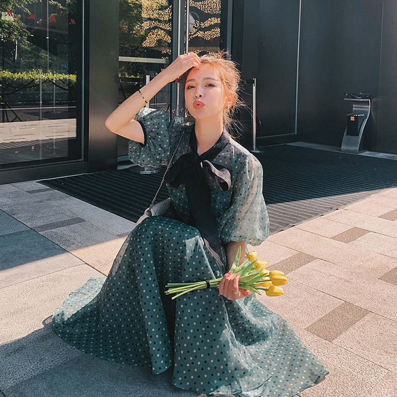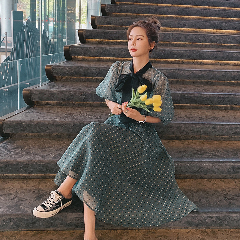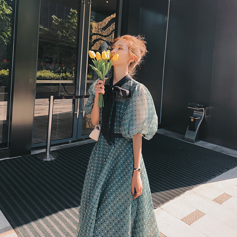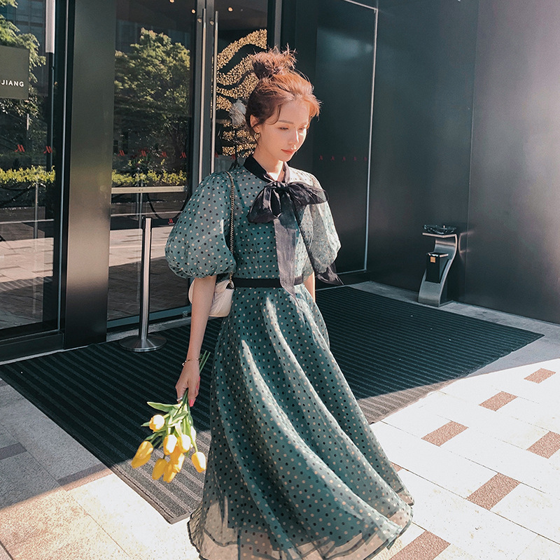 法式清新波点连衣裙女蝴蝶领泡泡袖高腰A字型收腰显瘦桔梗休闲裙