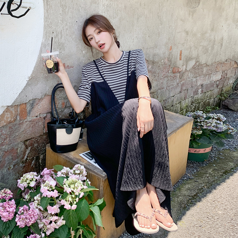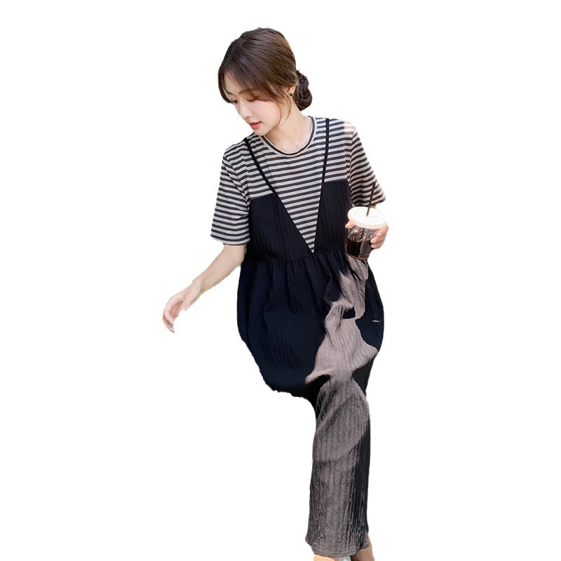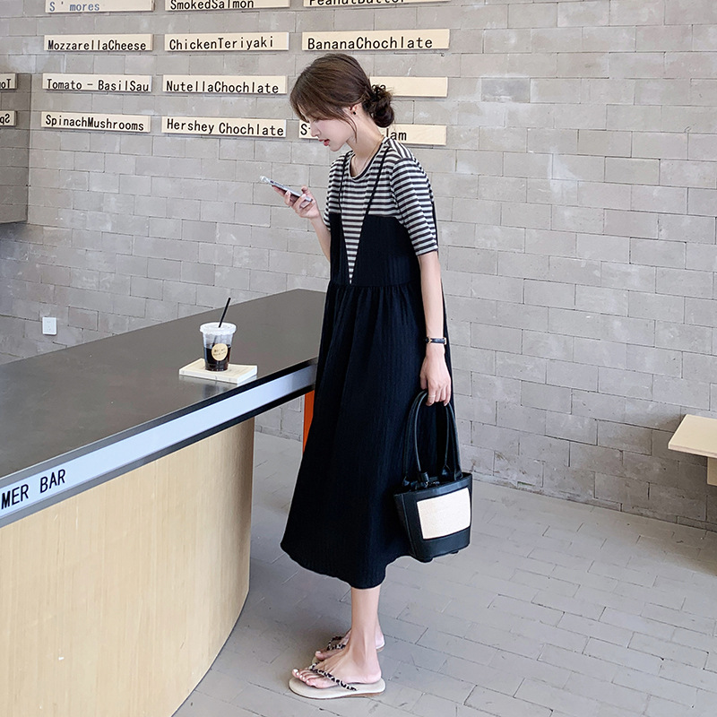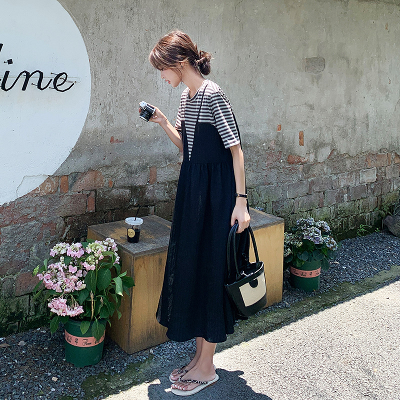韩系撞色条纹拼接气质假两件连衣裙女圆领高腰显瘦简约时尚休闲裙