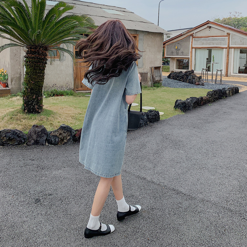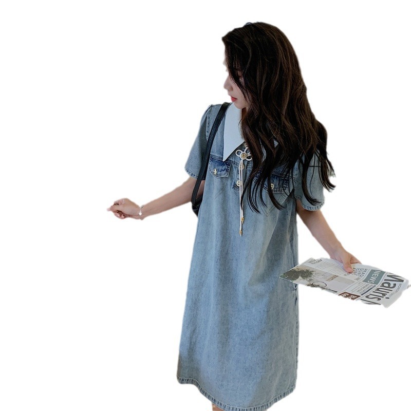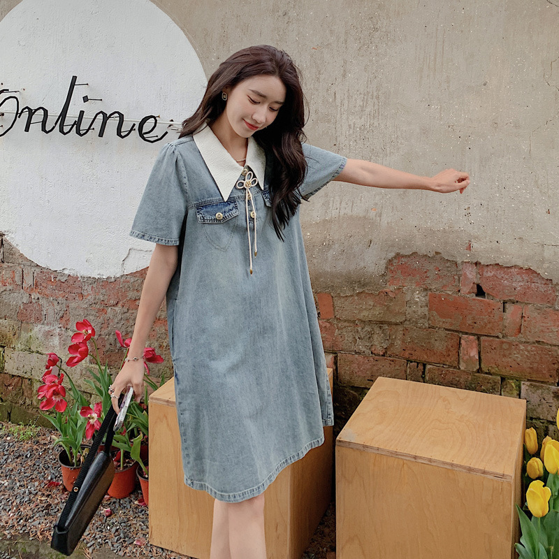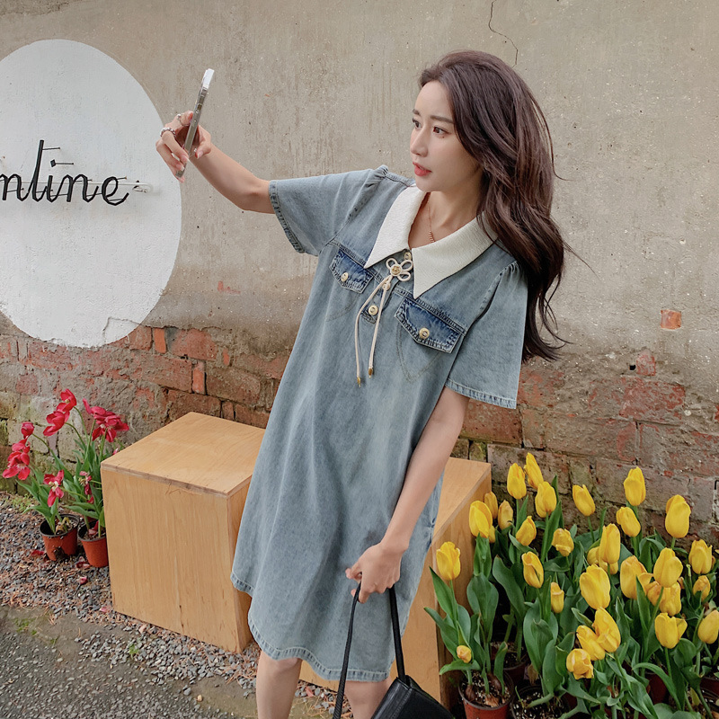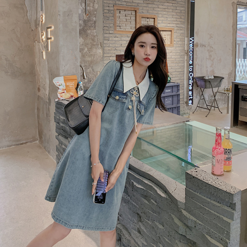 夏季新款复古撞色衬衫领拼接中国结牛仔裙宽松显瘦休闲连衣裙
