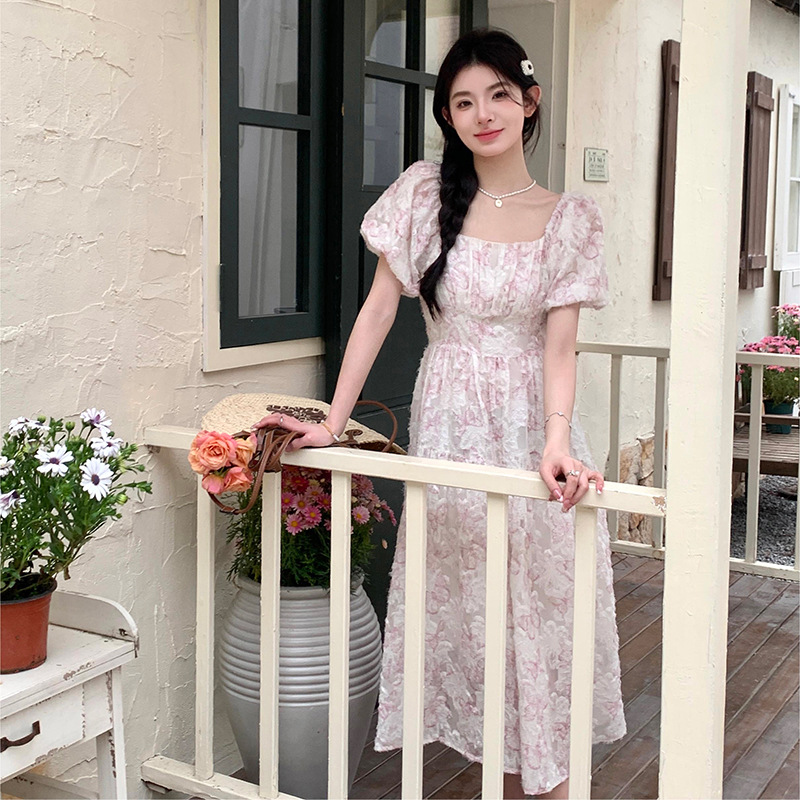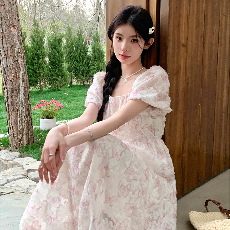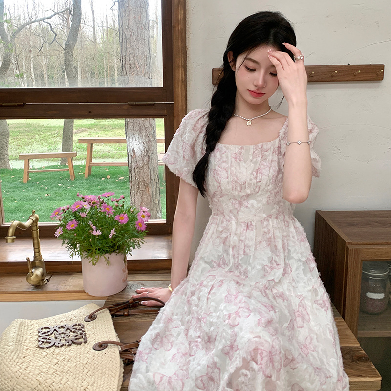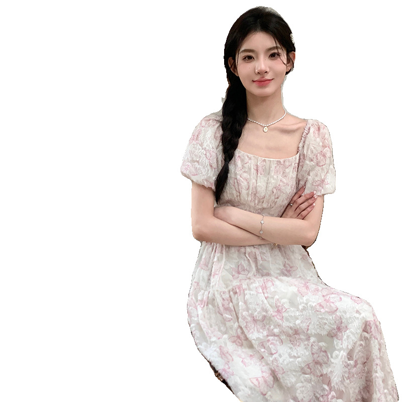 法式方领泡泡袖松紧显瘦印花连衣裙夏季高级感气质休闲超仙碎花裙