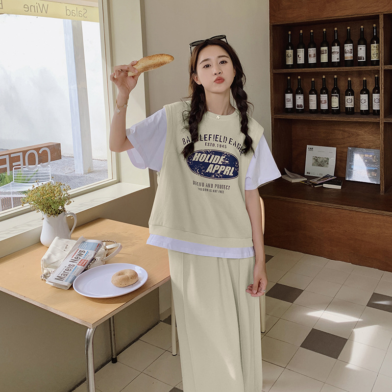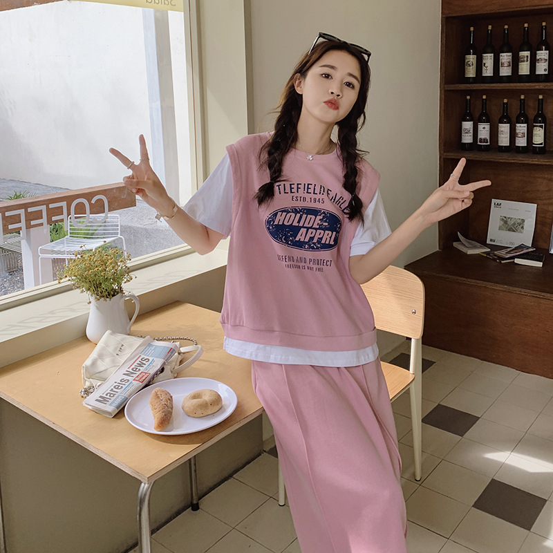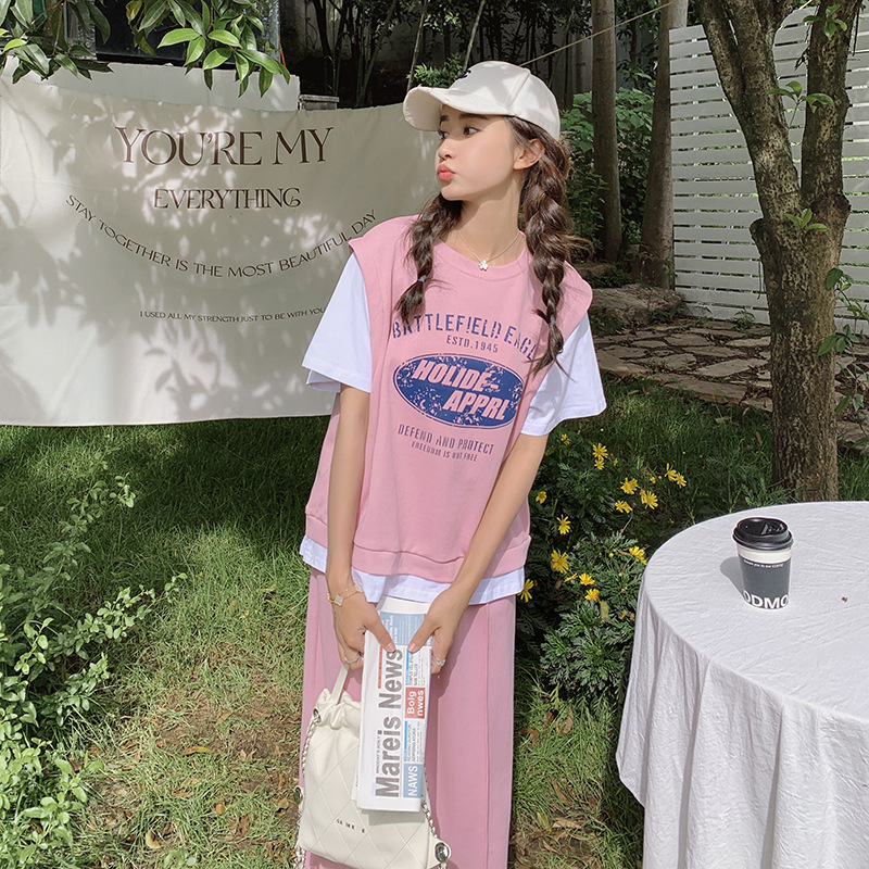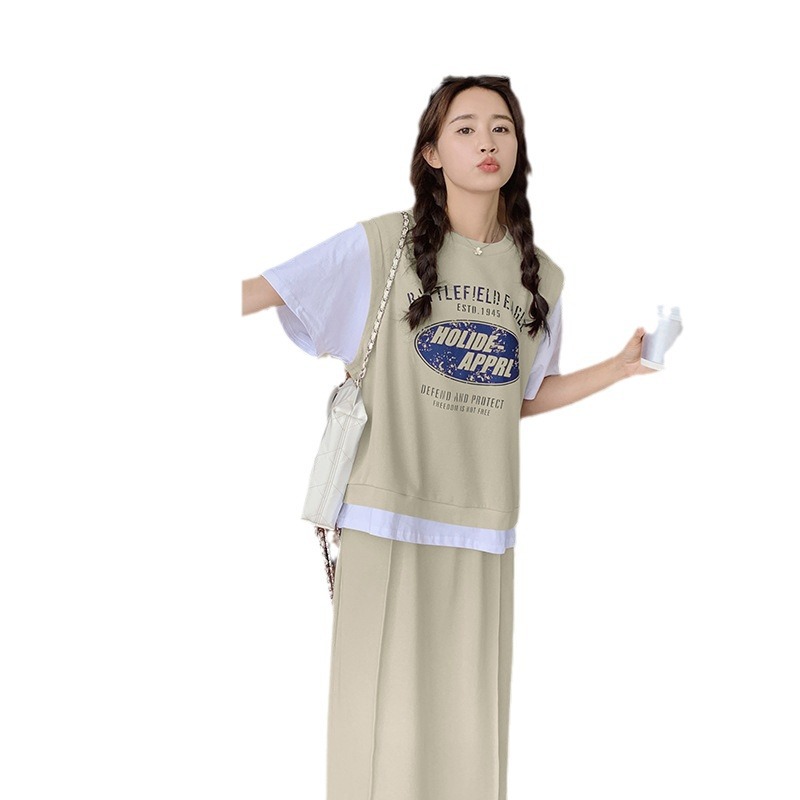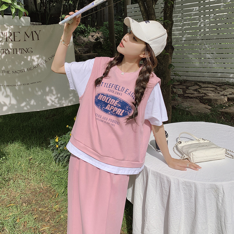 慵懒少女风字母印花假两件拼色卫衣半身裙套装女宽松休闲两件套夏