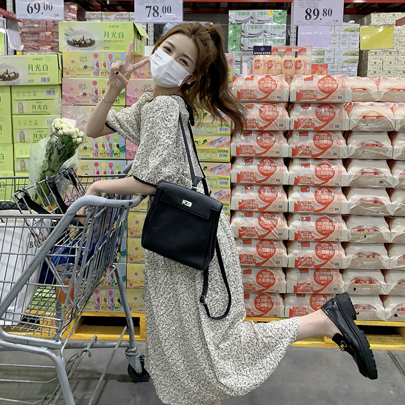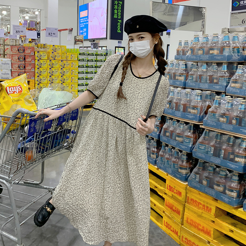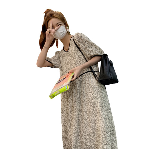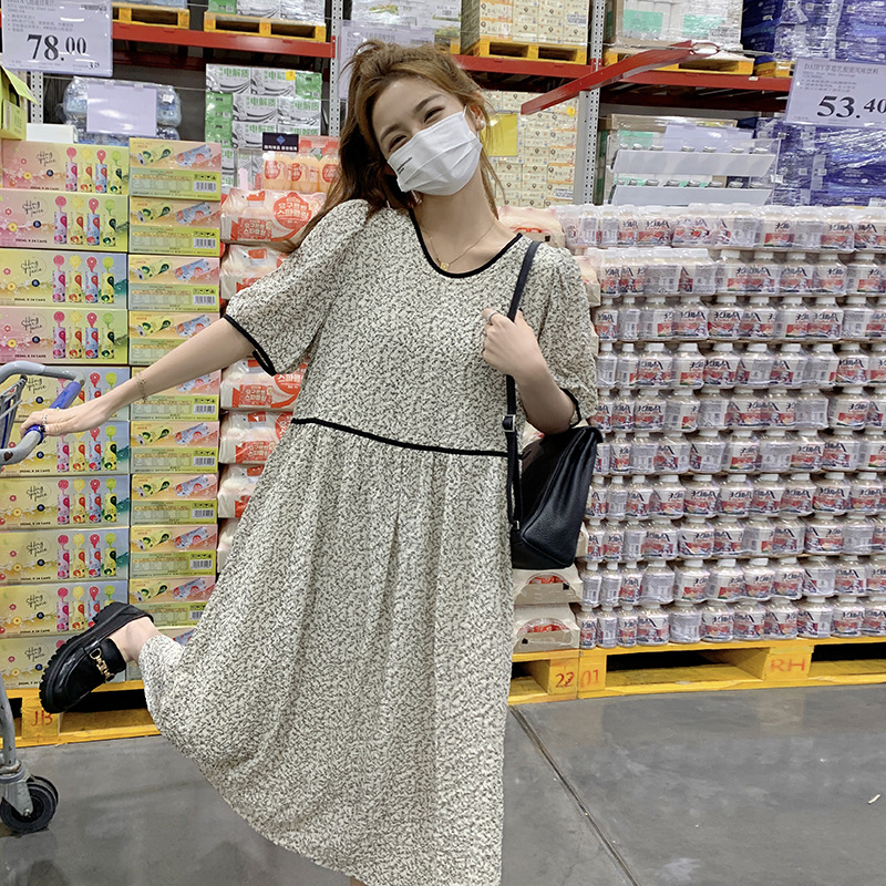 法式清新田园风碎花裙夏季新款撞色圆领宽松泡泡袖休闲连衣裙