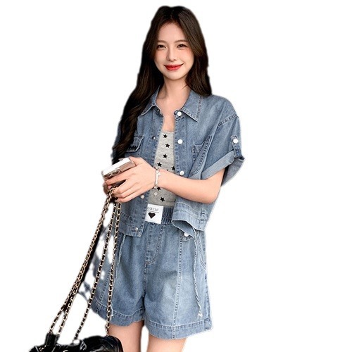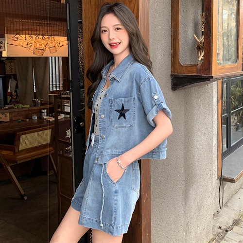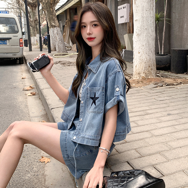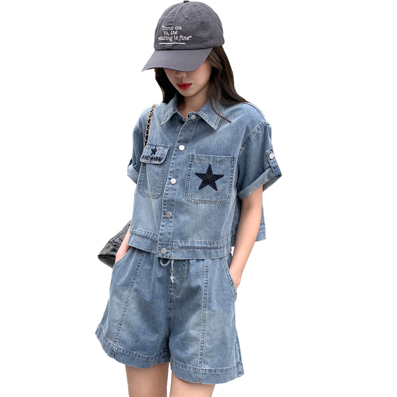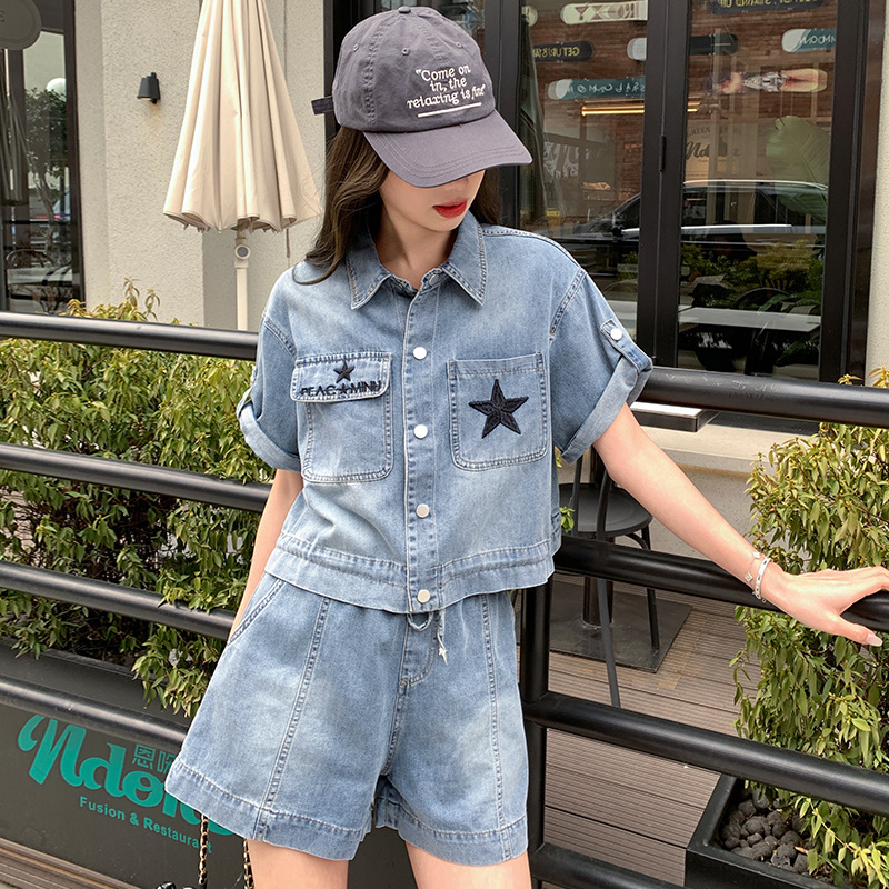 复古气质小翻领刺绣薄款牛仔短裤两件套酷飒宽松抽绳新款夏季套装
