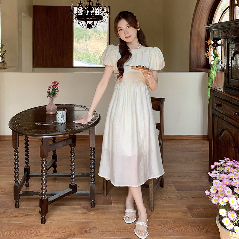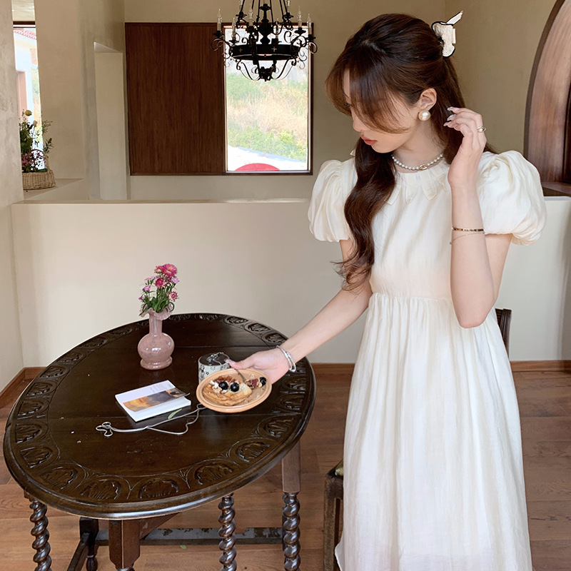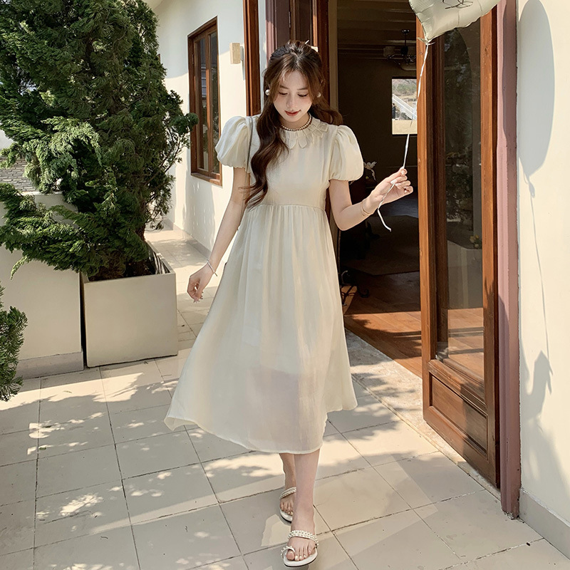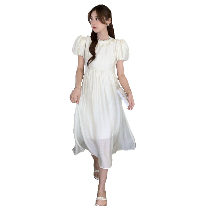 法式轻熟风落肩泡泡短袖高腰压褶A字中长款连衣裙休闲甜美仙女裙
