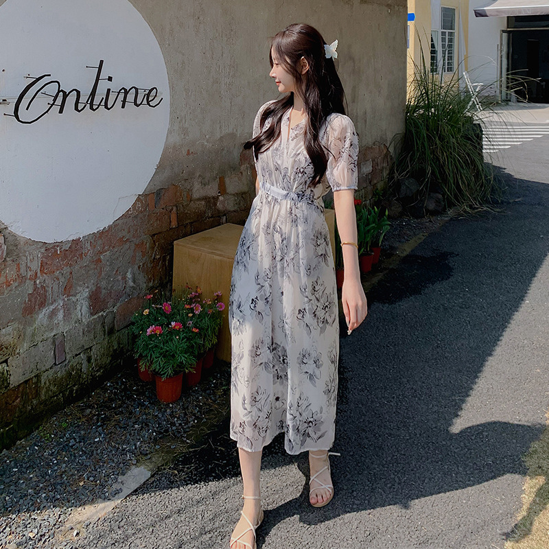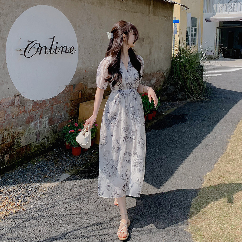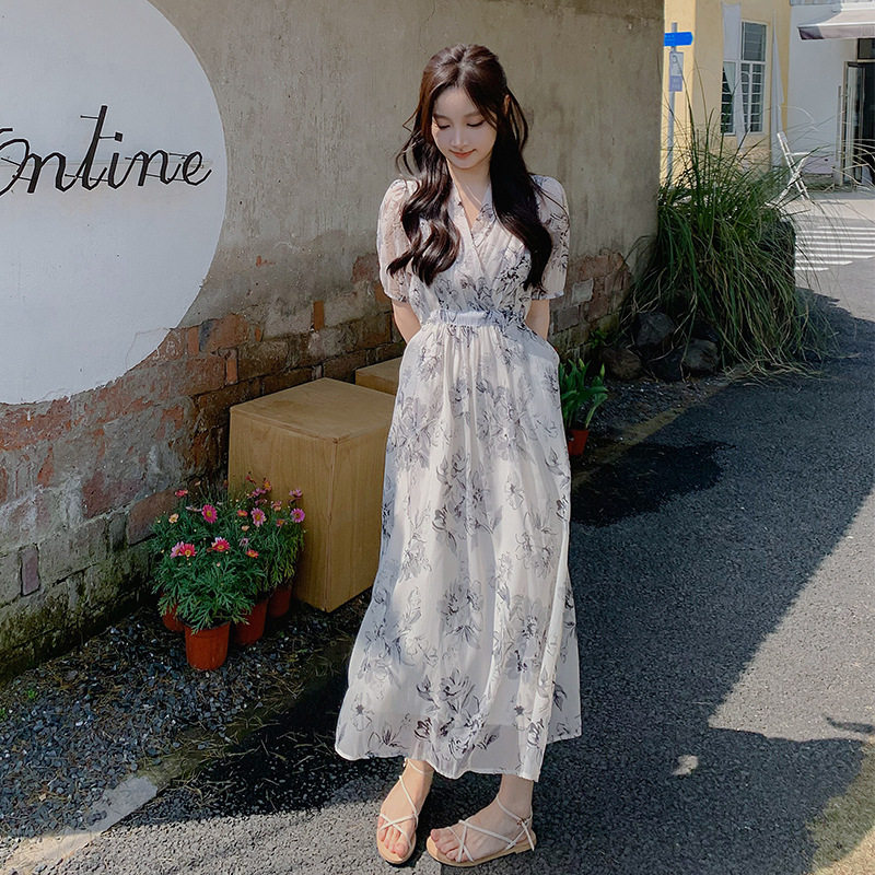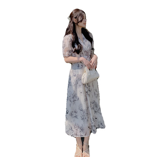 新中式夏季复古V领高腰显瘦短袖连衣裙古典国风优雅休闲长裙
