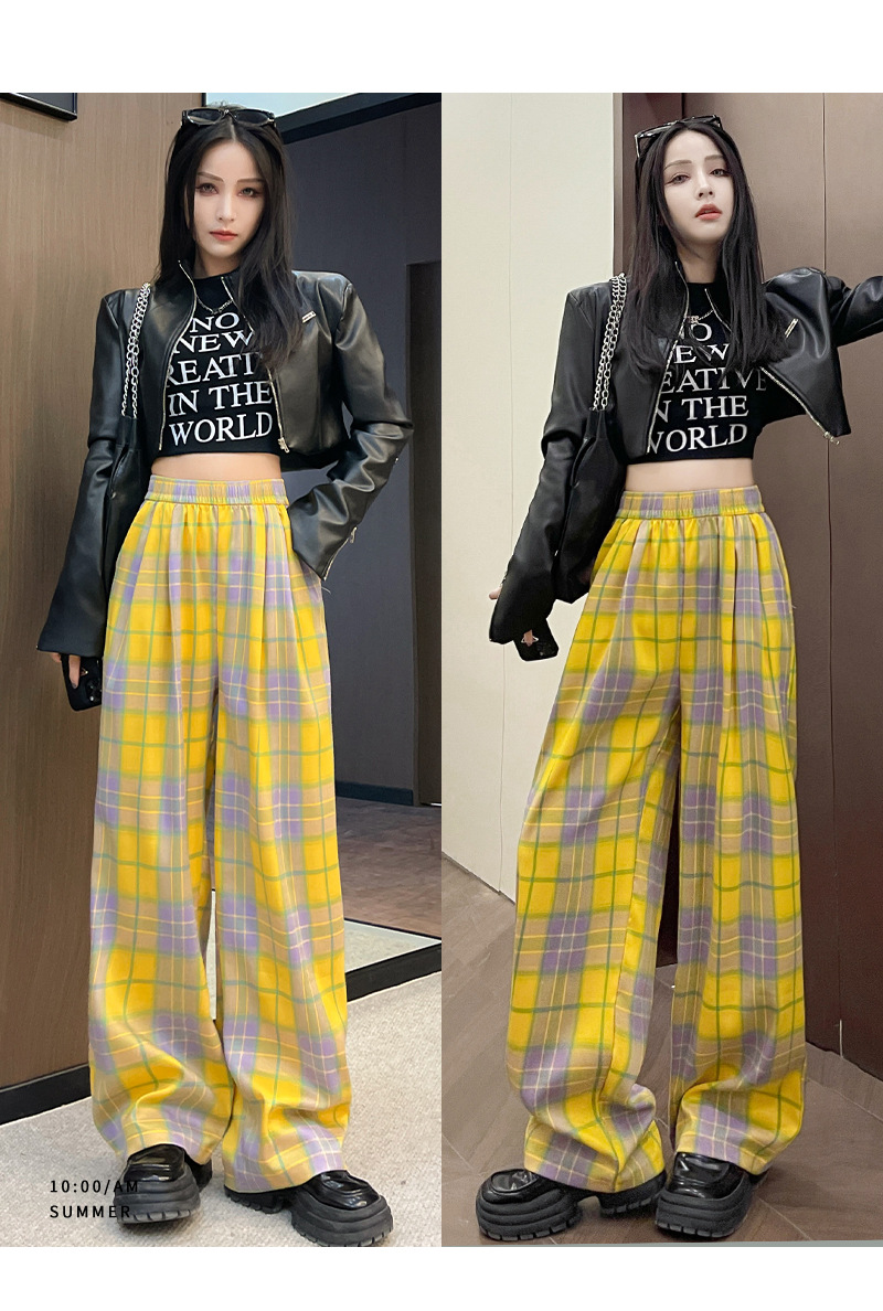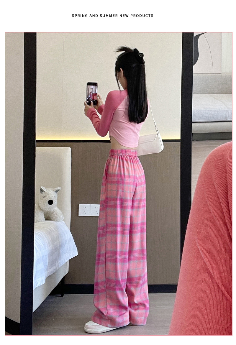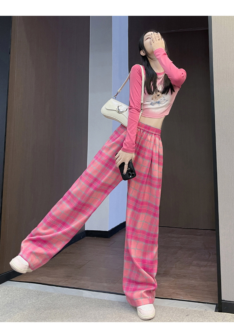 24年秋季新款多巴胺格子裤女高腰百搭休闲长裤窄版垂感撞色阔腿裤