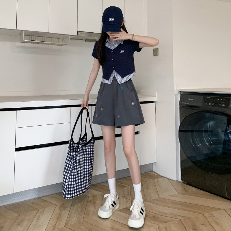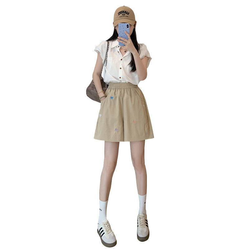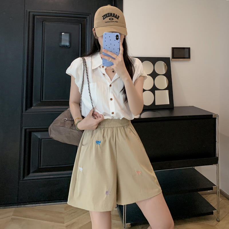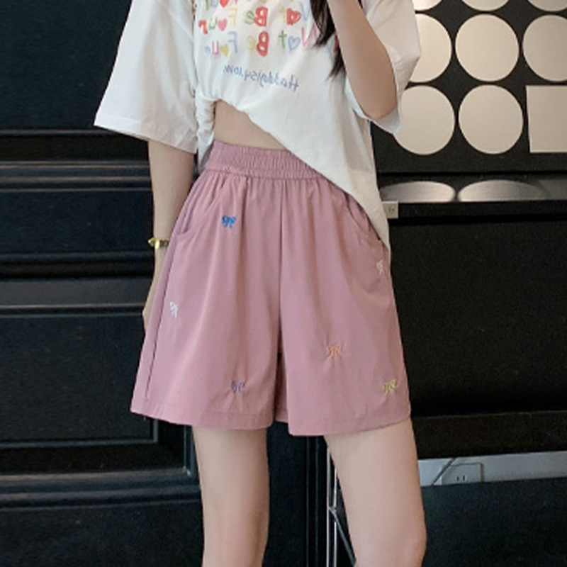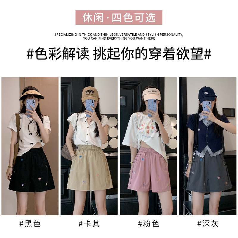 蝴蝶结刺绣短裤女夏季韩版高腰A字工装三分裤显瘦休闲阔腿运动裤