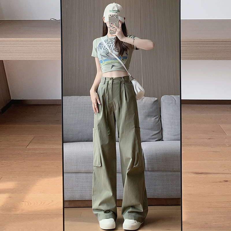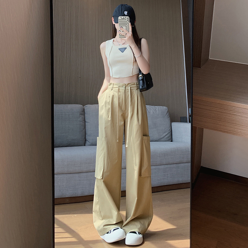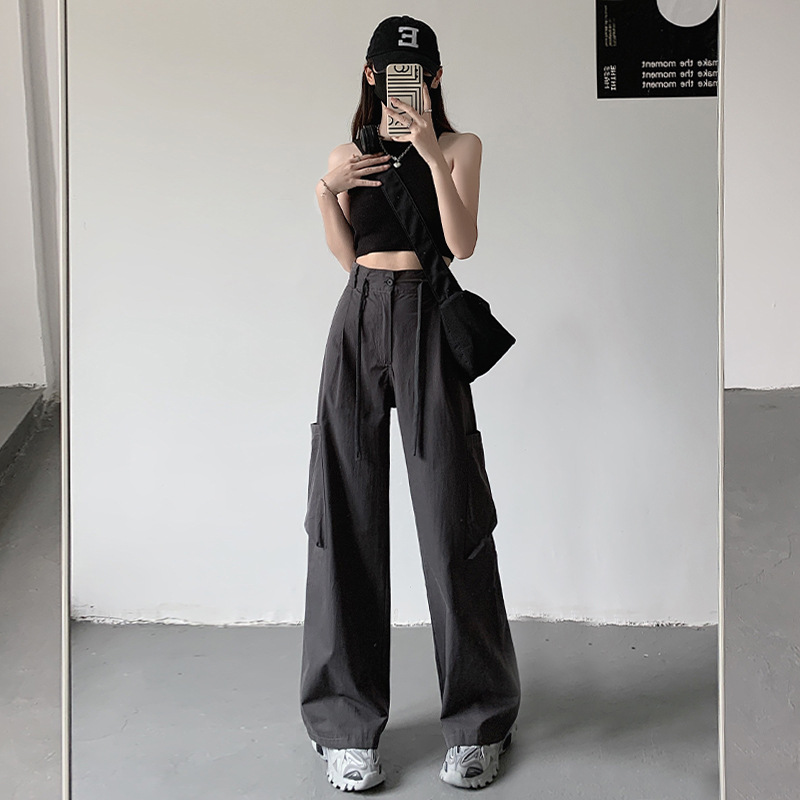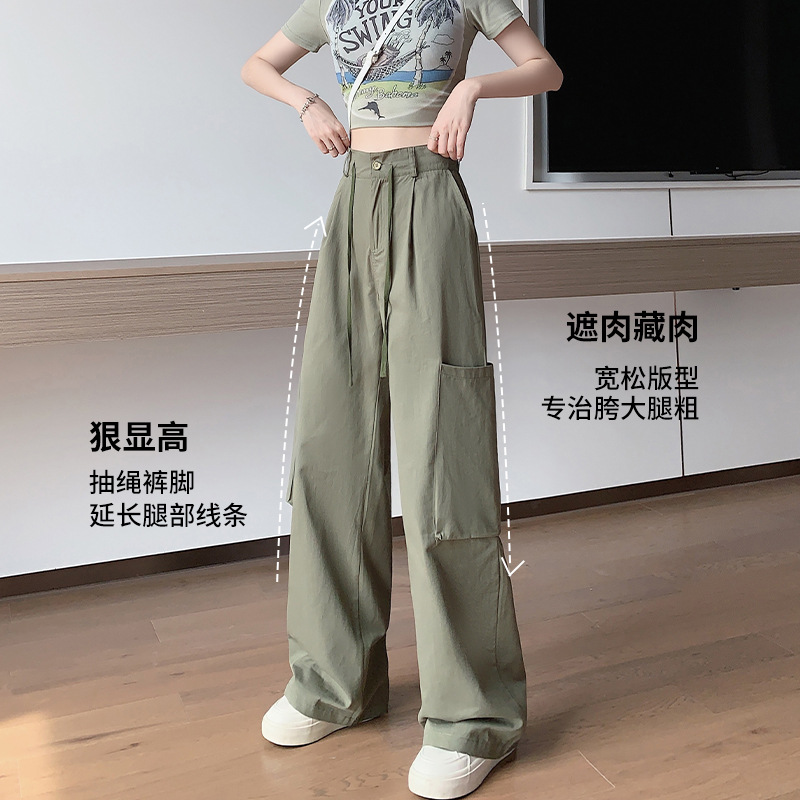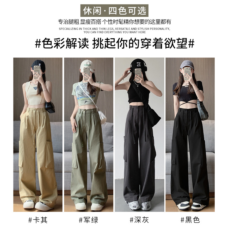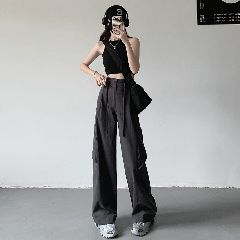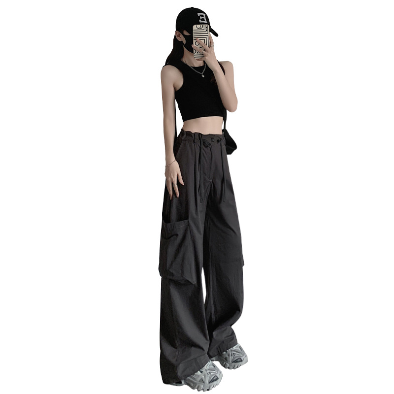 美式街头设计感阔腿工装裤女夏季宽松大口袋抽绳拖地裤运动休闲裤