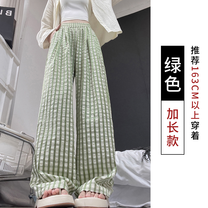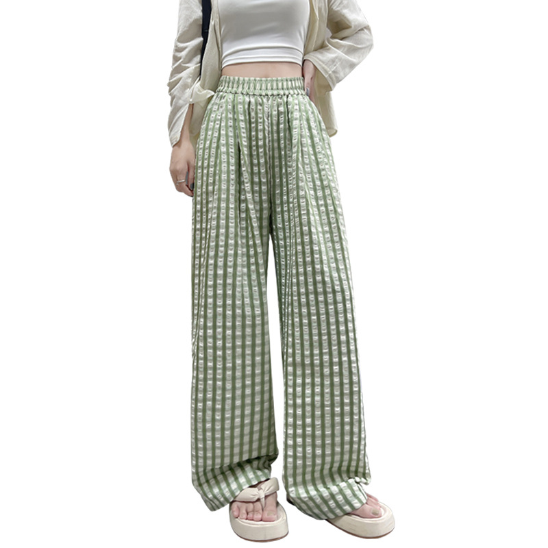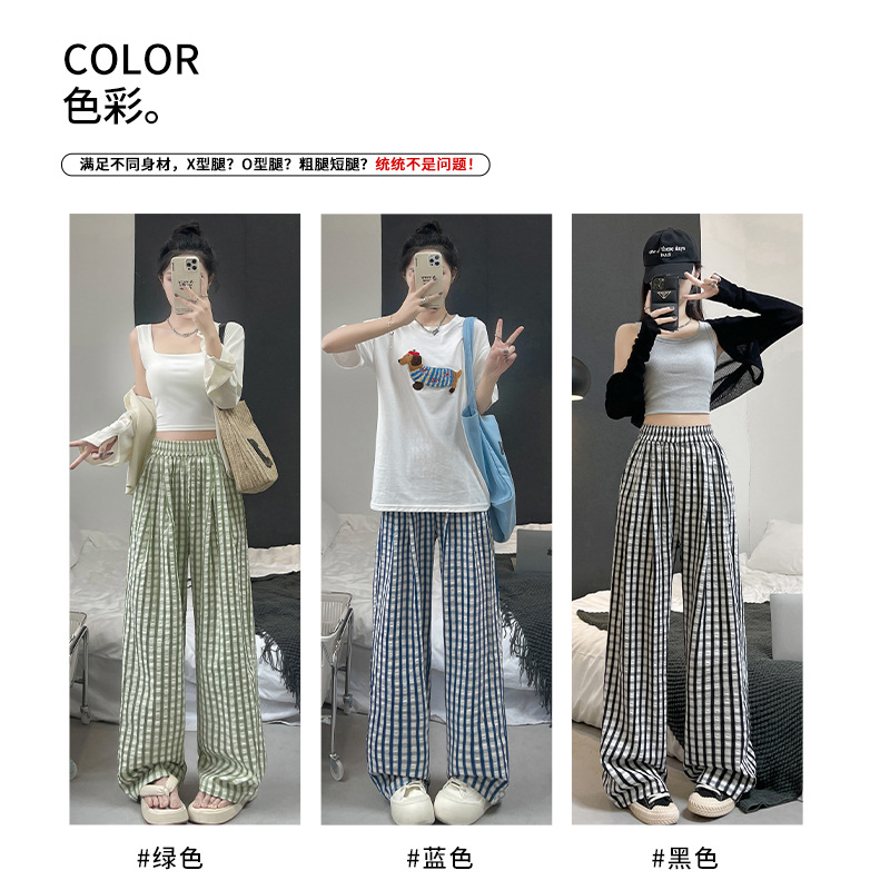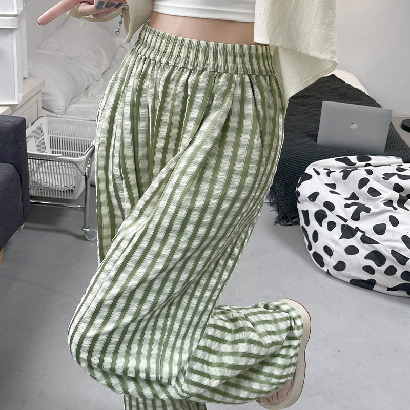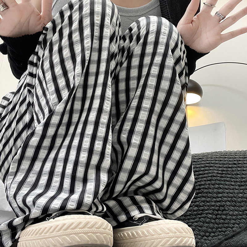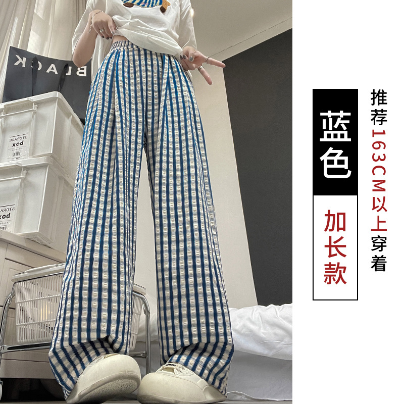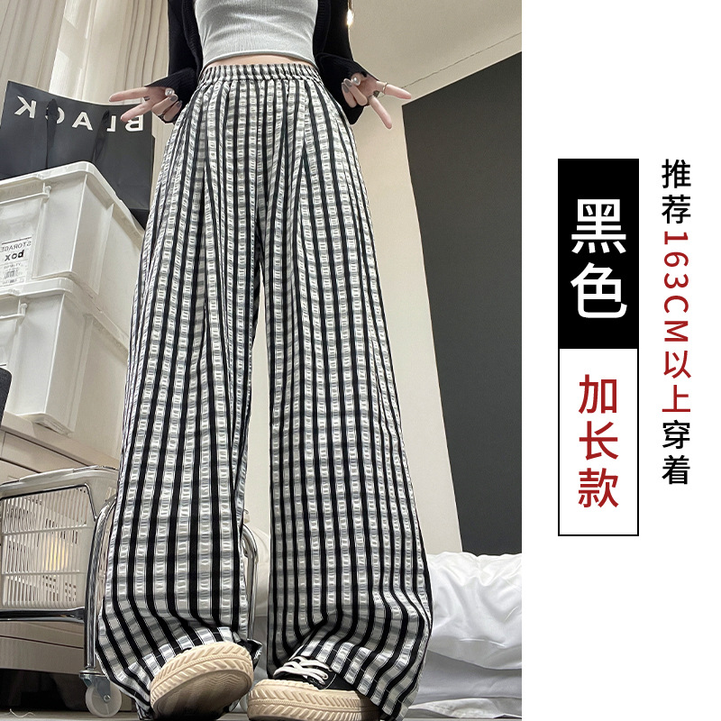 复古竖条纹阔腿裤子女夏季高腰宽松韩版直筒休闲裤慵懒窄版格子裤