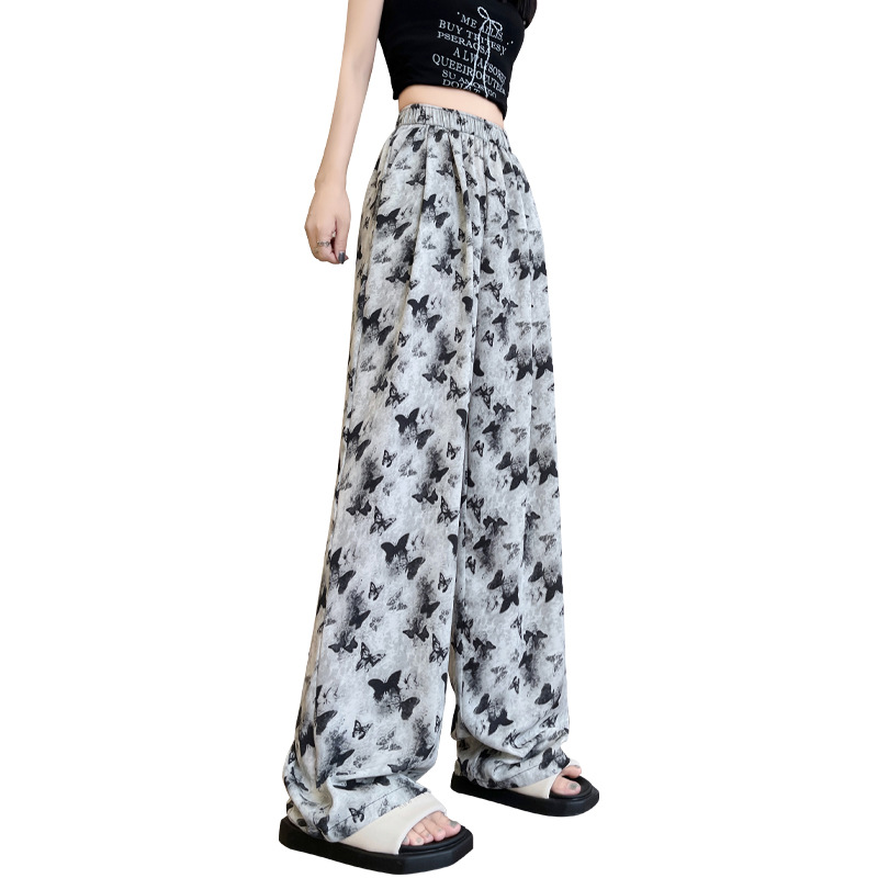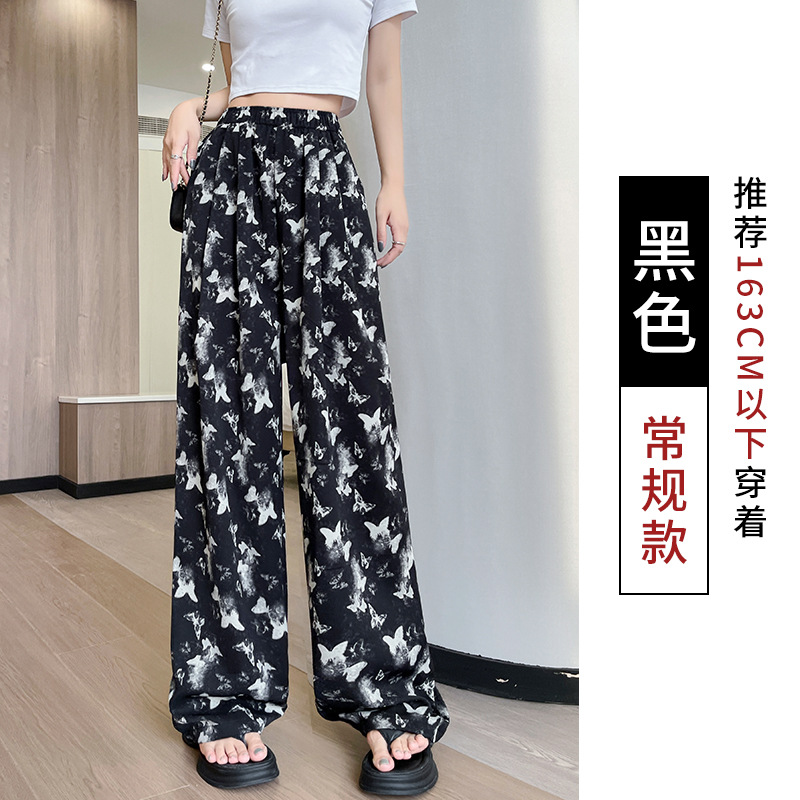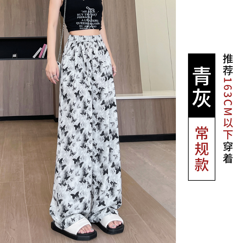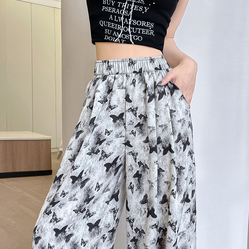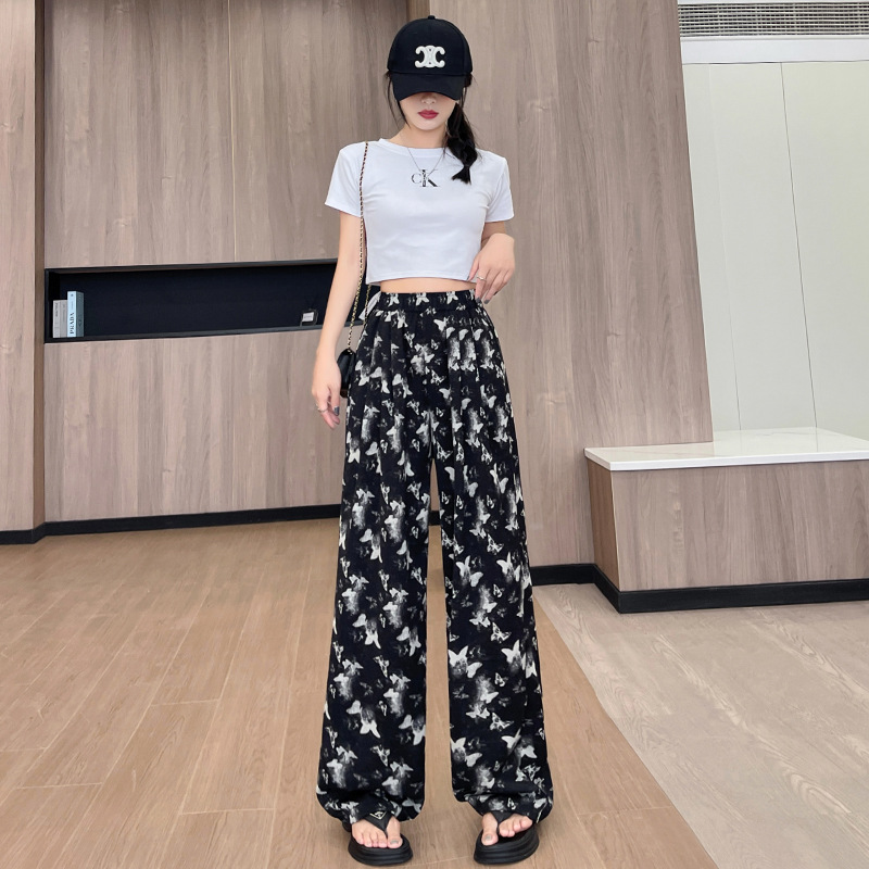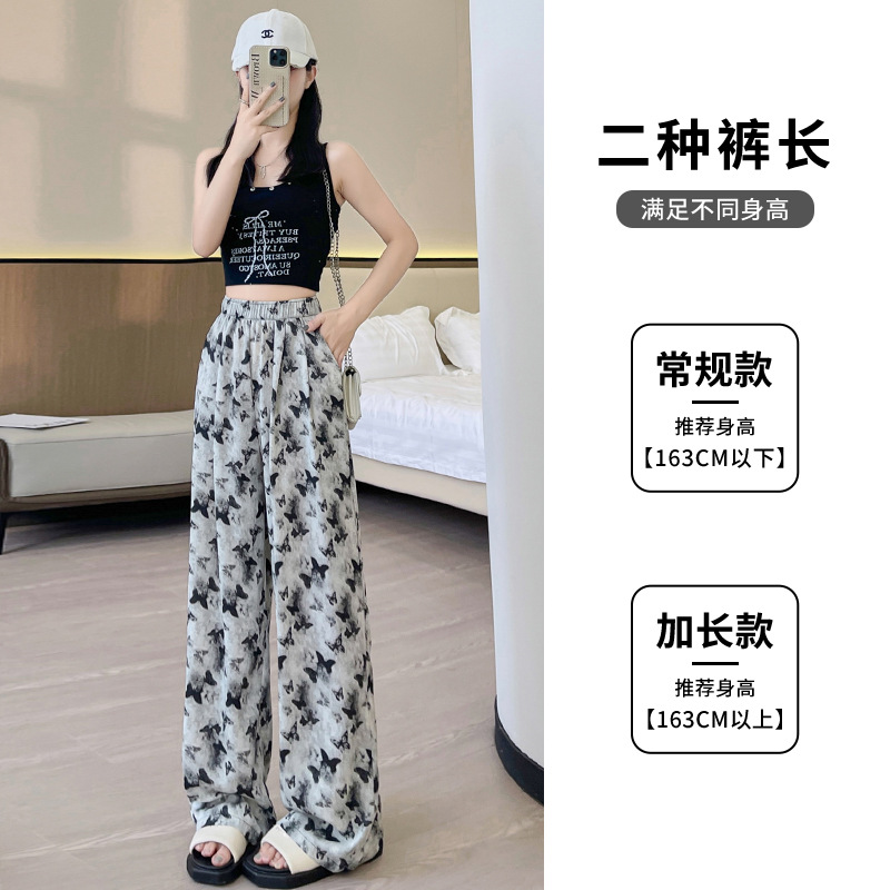 蝴蝶水墨画阔腿裤女夏款高腰直筒新中式休闲裤冰丝扎染垂感长裤子