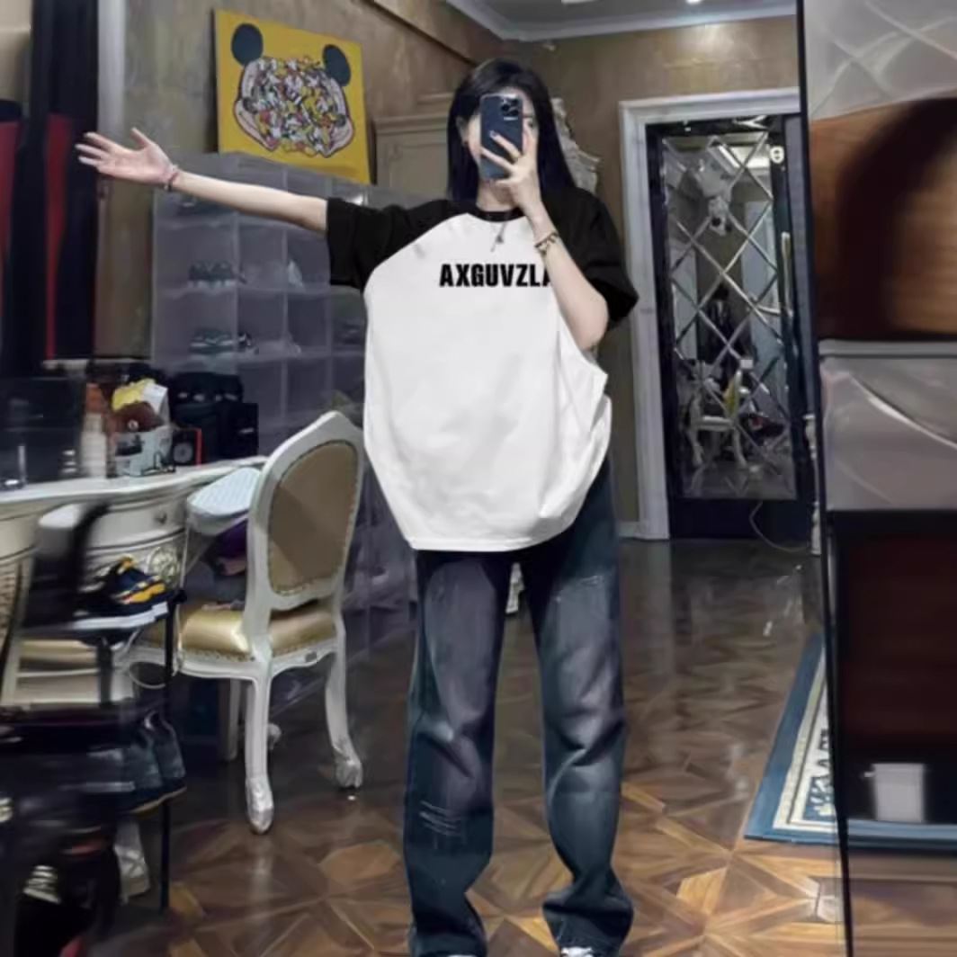 美式oversize插肩短袖t恤女夏季新款复古国潮宽松情侣上衣ins