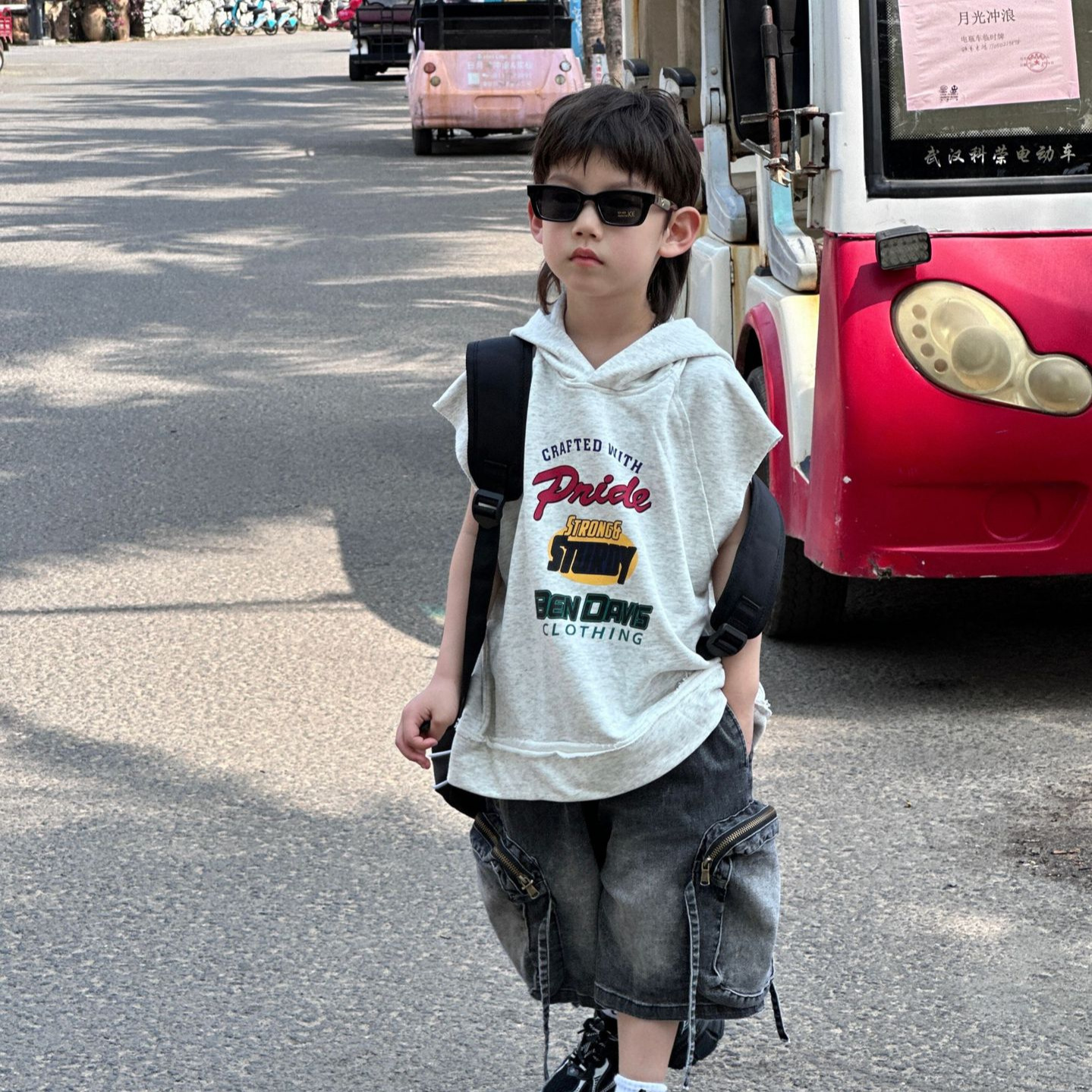 泰如夏季新款韩版男童字母美式连帽无袖卫衣儿童百搭上衣潮