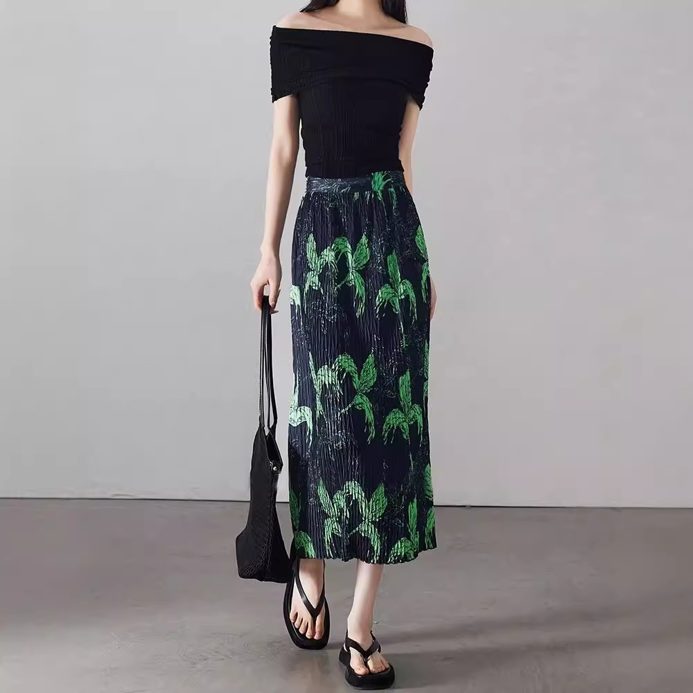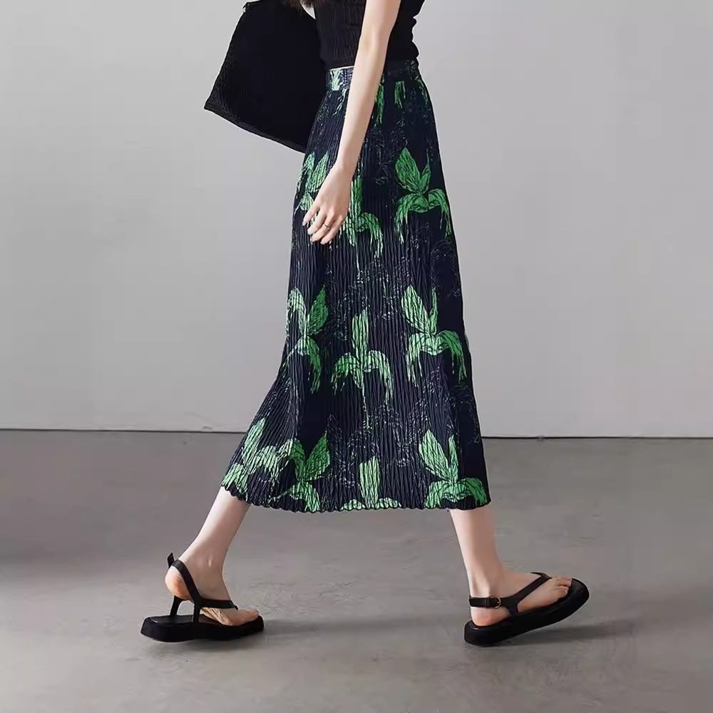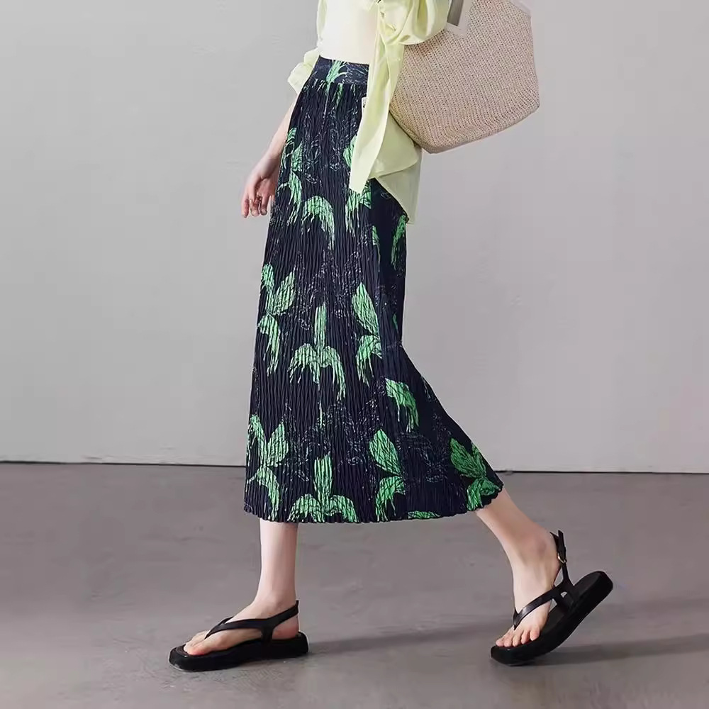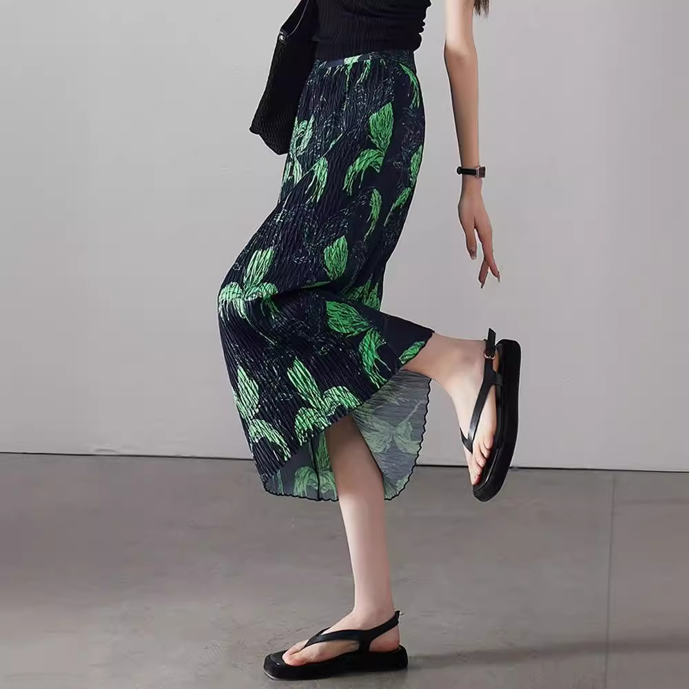 复古三宅褶皱裙印花松紧腰半身裙女夏百搭显瘦牙签皱直筒长裙