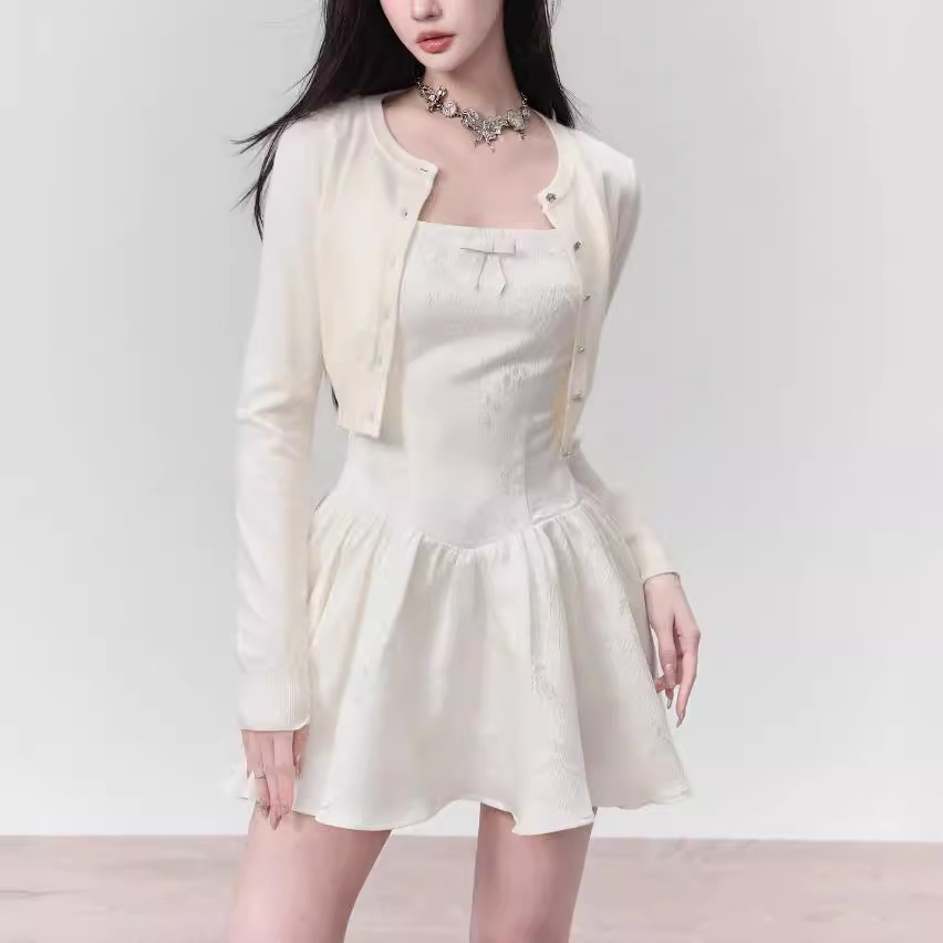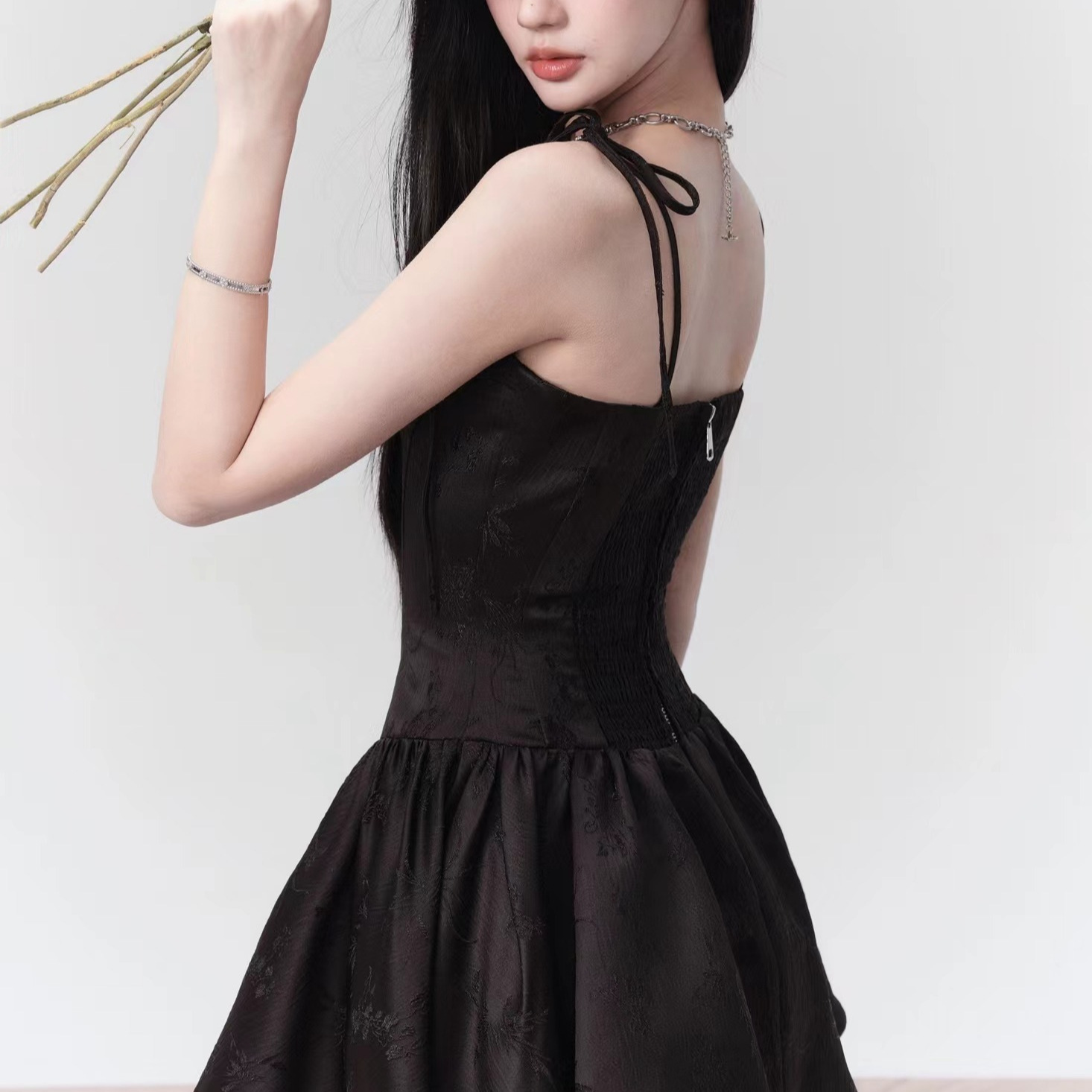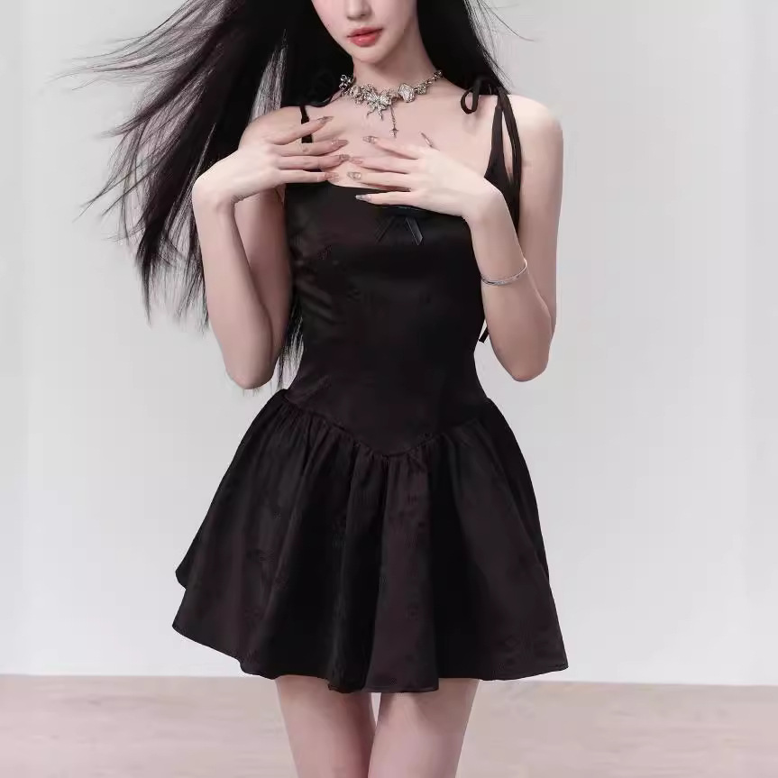 春日出逃千金风蝴蝶结系带吊带裙提花黑白公主蓬蓬裙