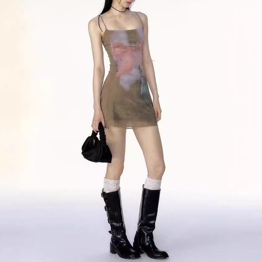 夏季复古修身显瘦性感辣妹收腰网纱印花包臀连衣裙长裙女