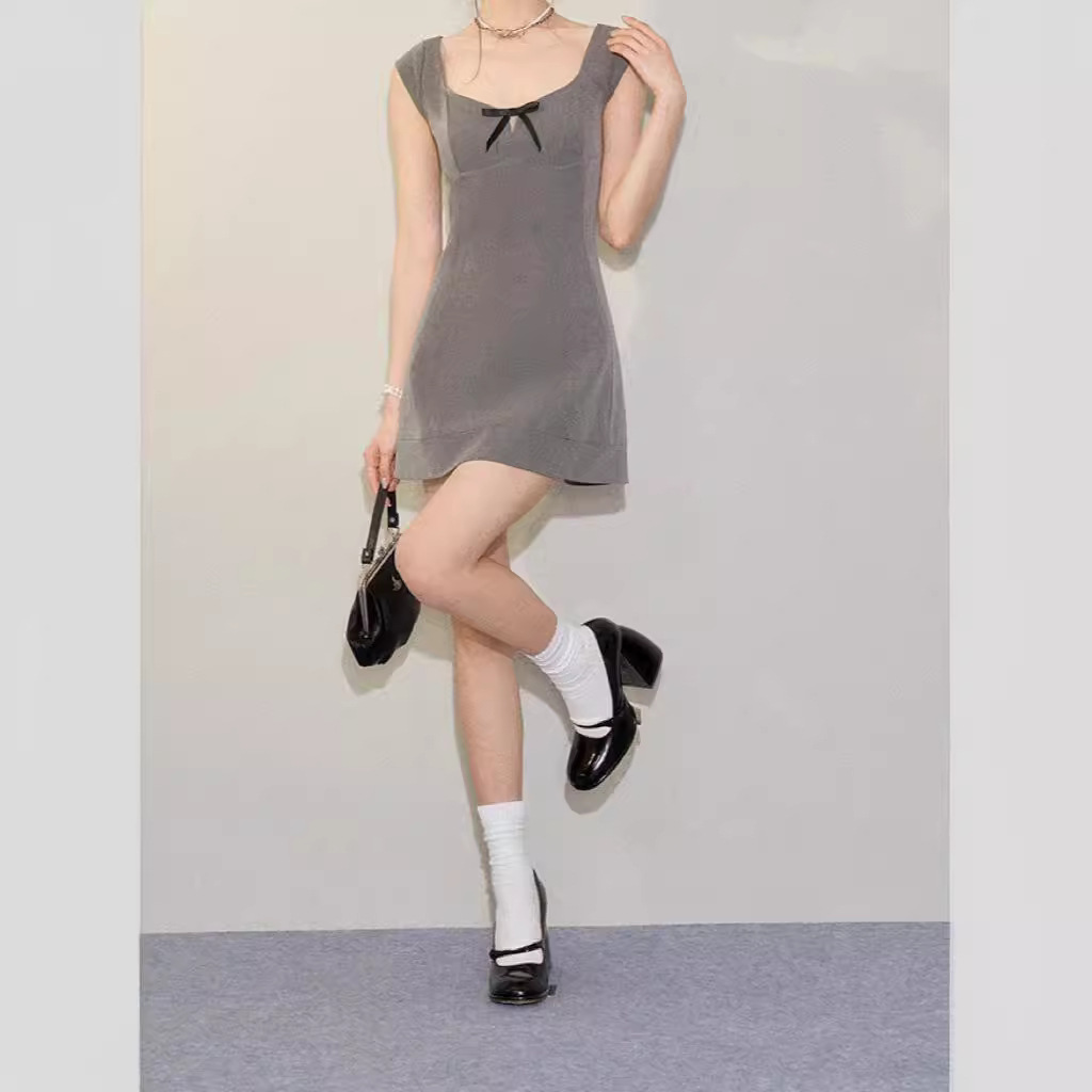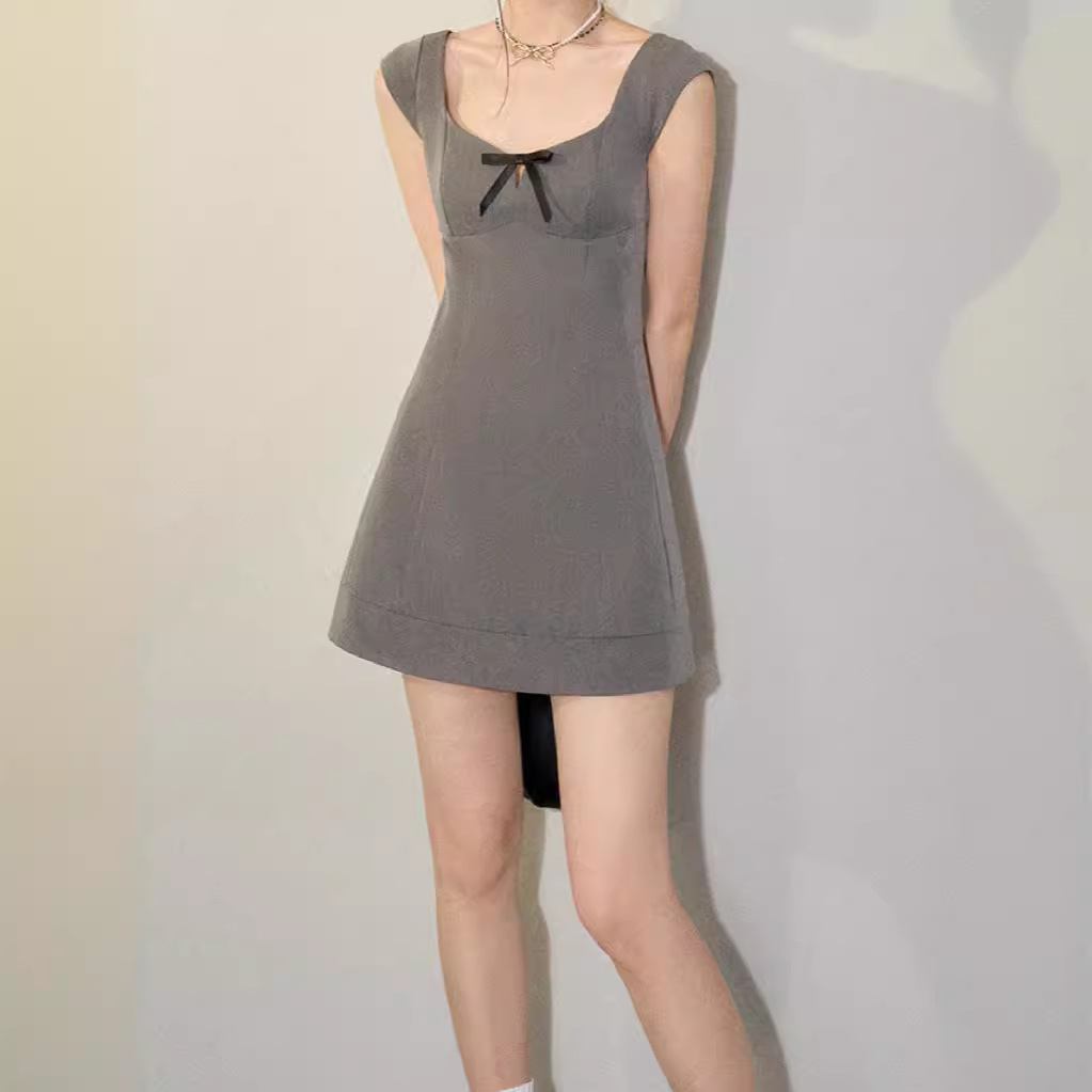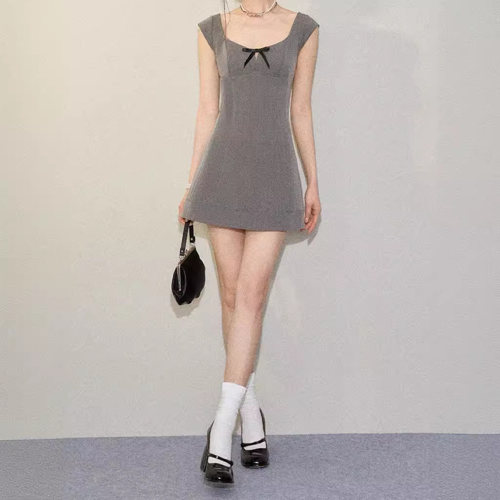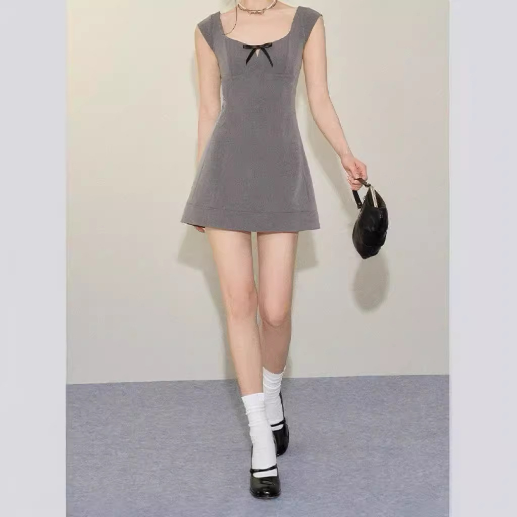 法式灰色蝴蝶结U领无袖收腰甜美a字连衣裙女