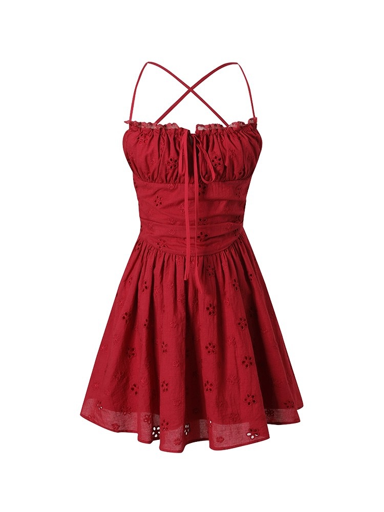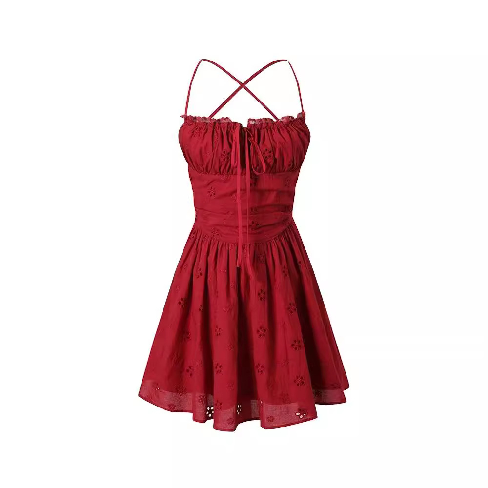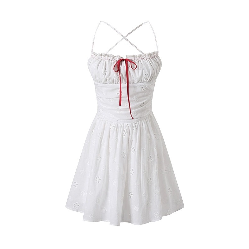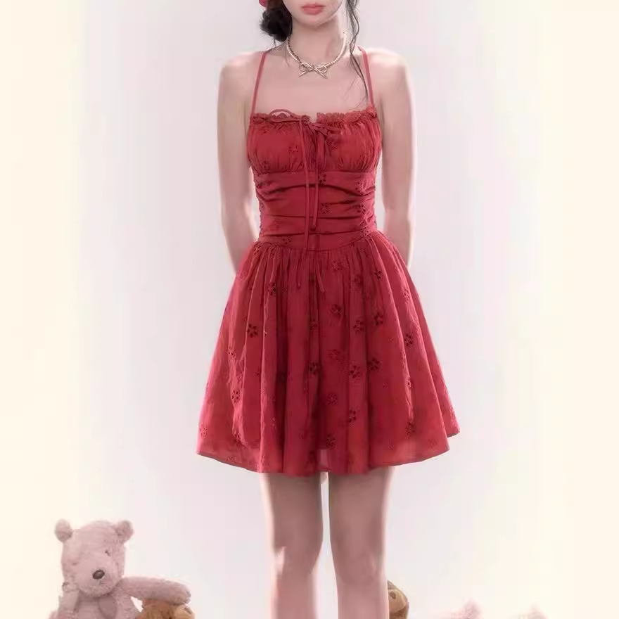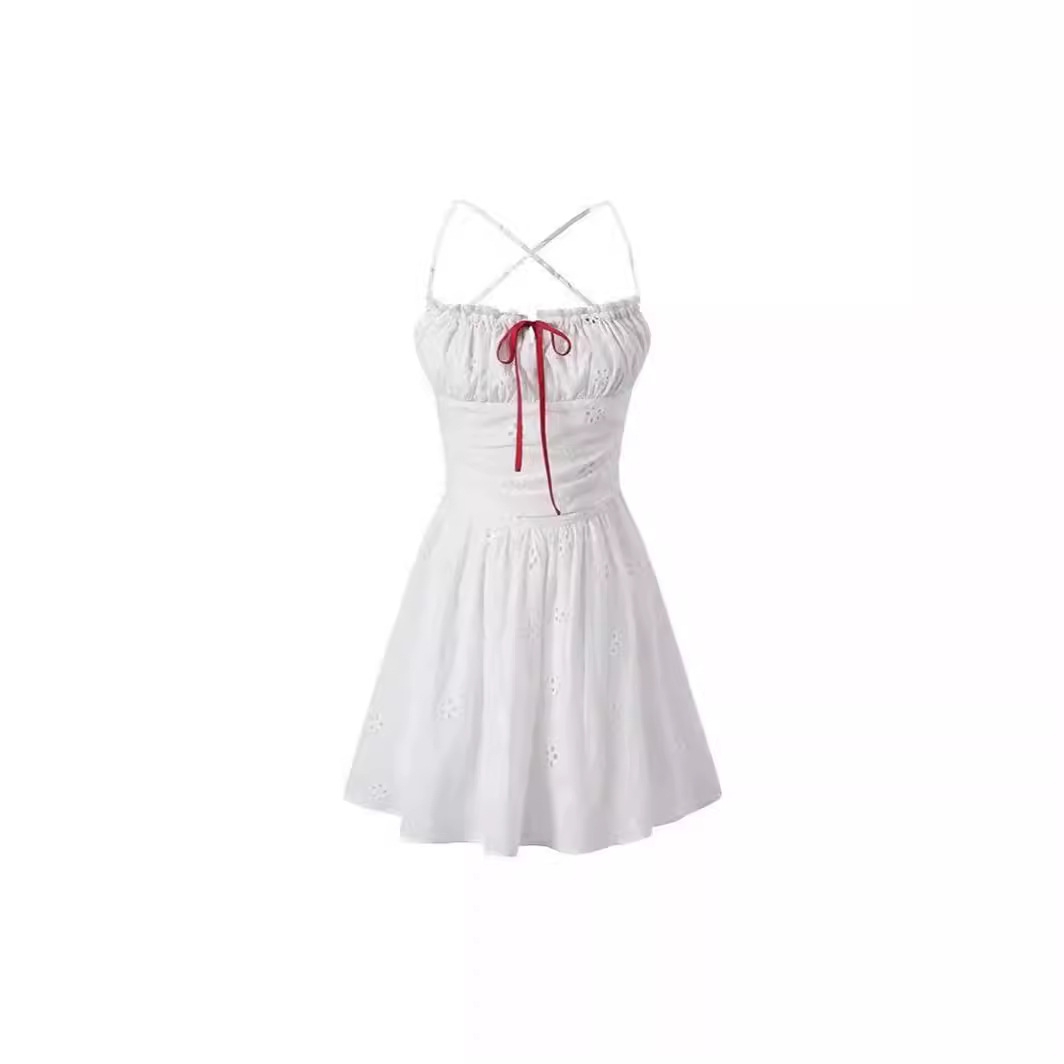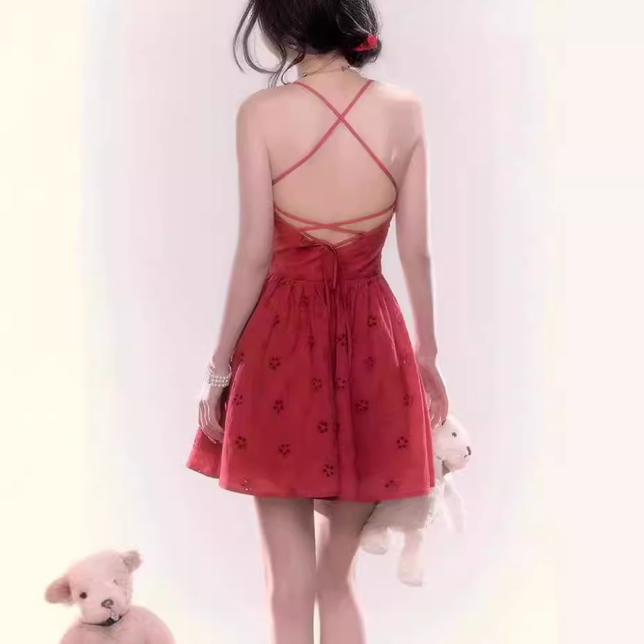 法式假日蕾丝绣花纯欲蝴蝶结露背吊带连衣裙女