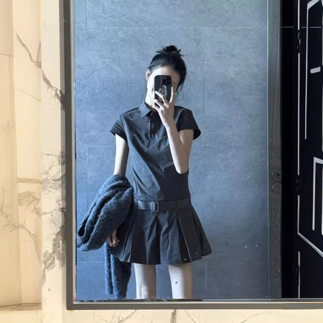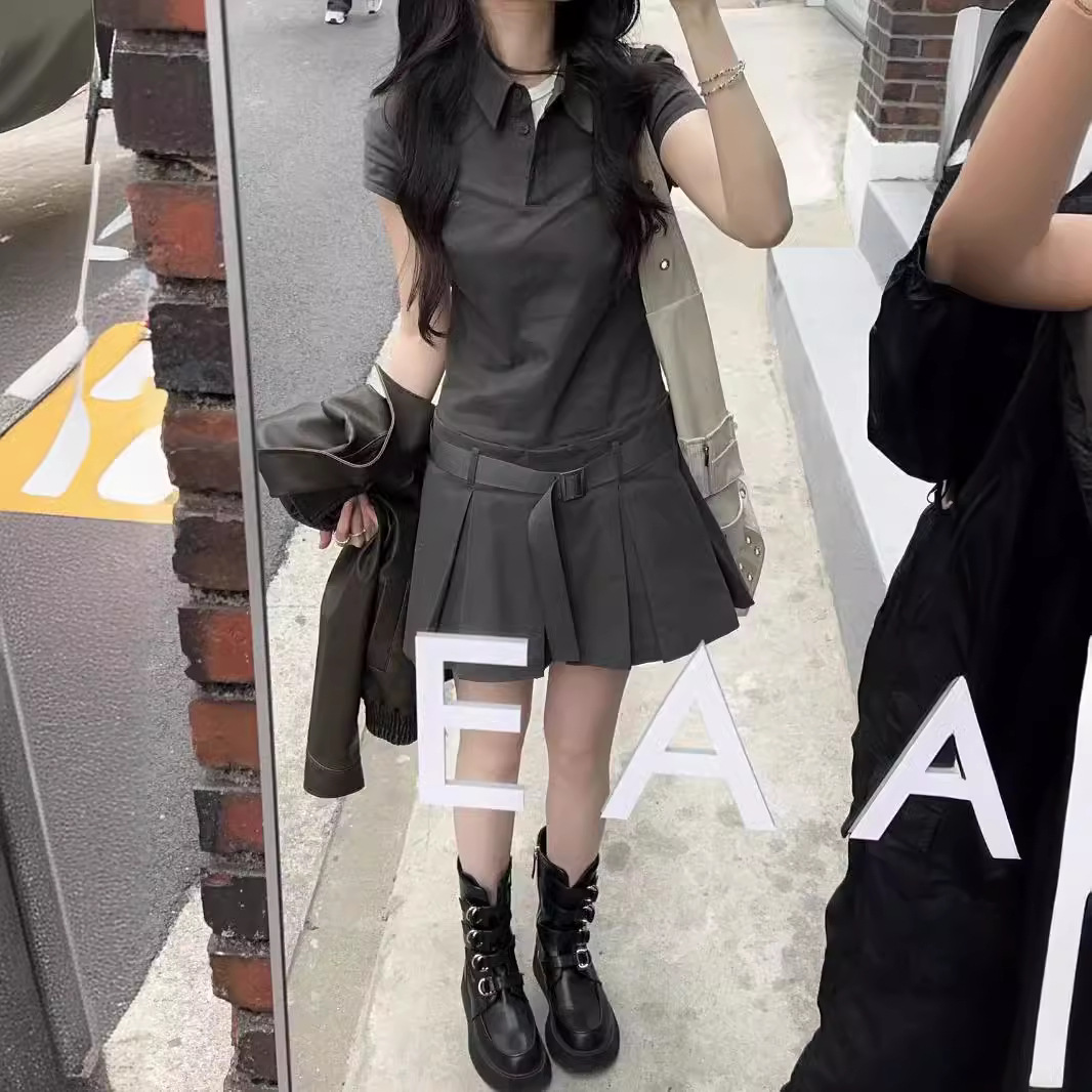 夏季灰色简约polo领棉短袖连衣裙女假两件压褶百褶裙