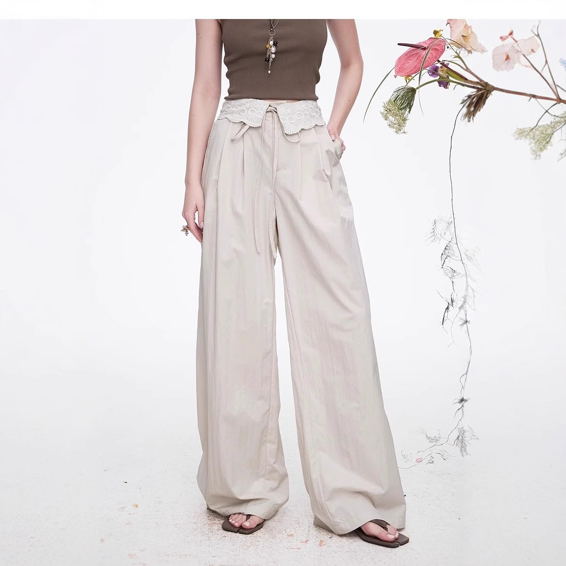 翻边蝴蝶结蕾丝拼接裤子女2025春季新款户外宽松镰刀裤