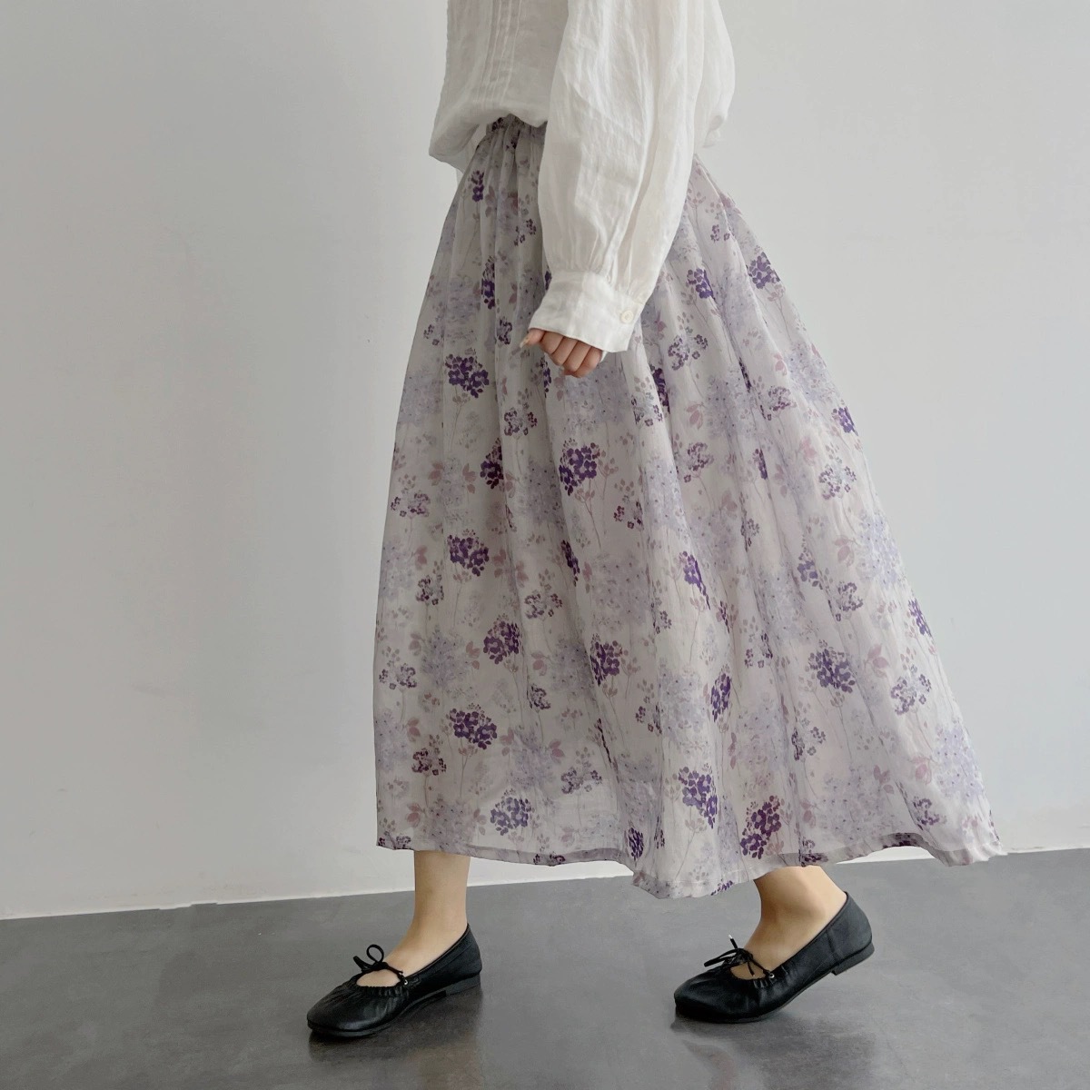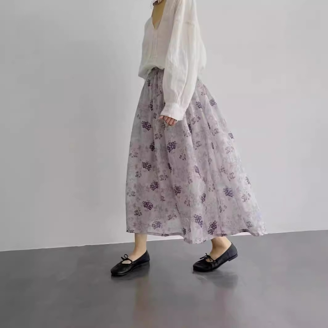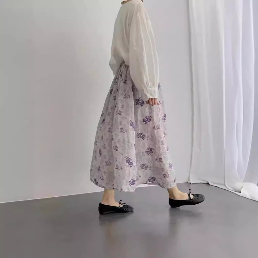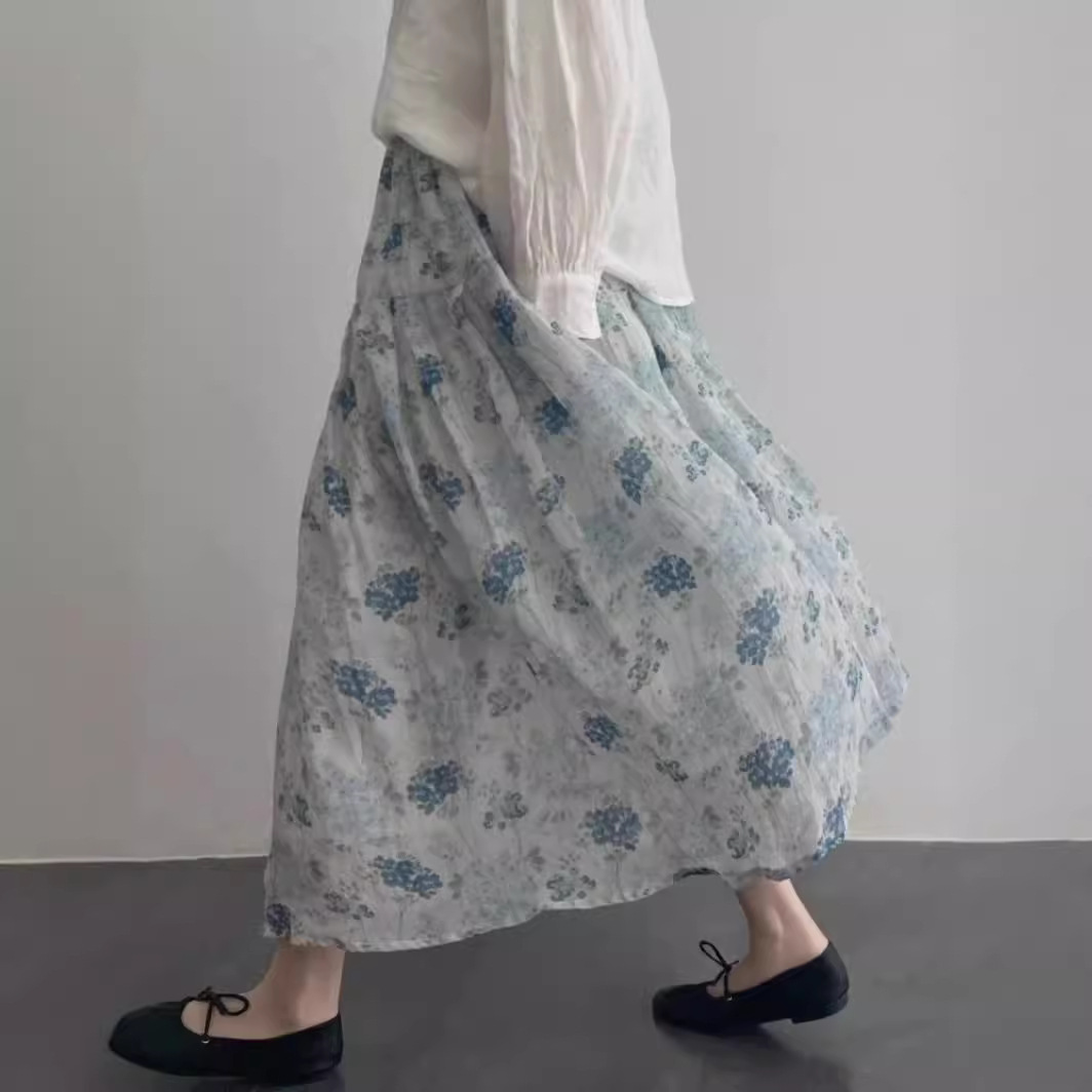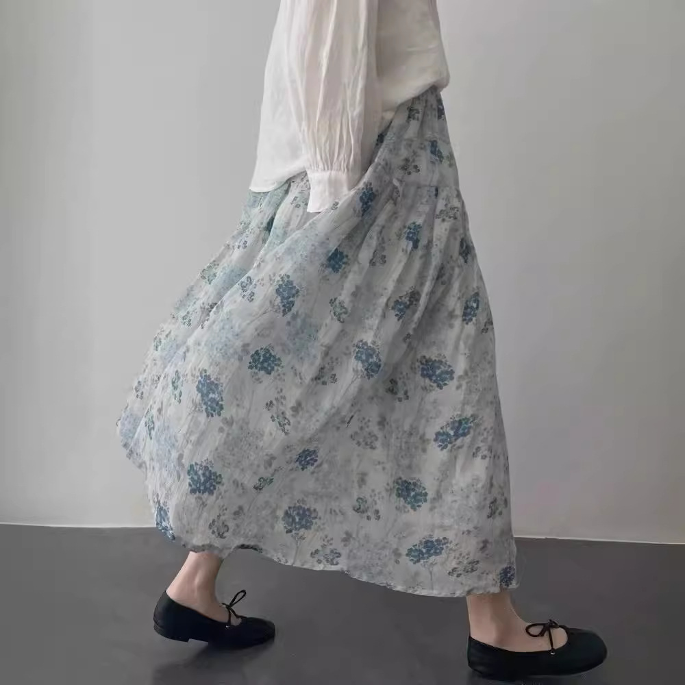法式复古森系蓝色苎麻半身裙女夏季小个子棉麻半裙仙女碎花裙长裙