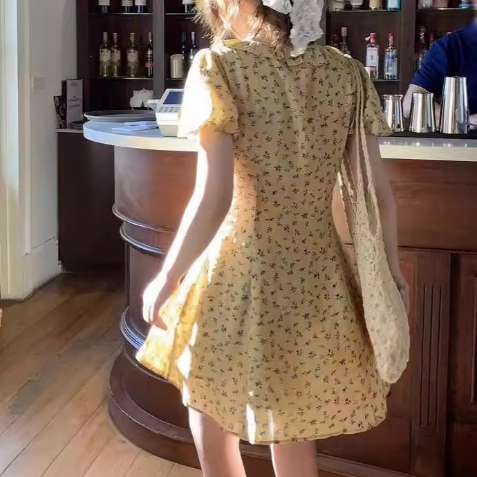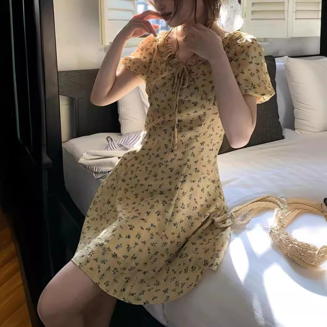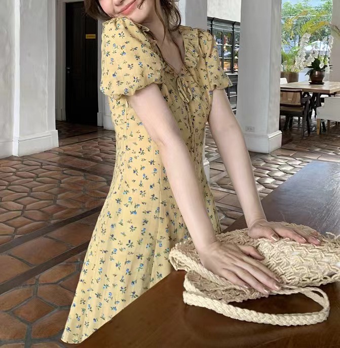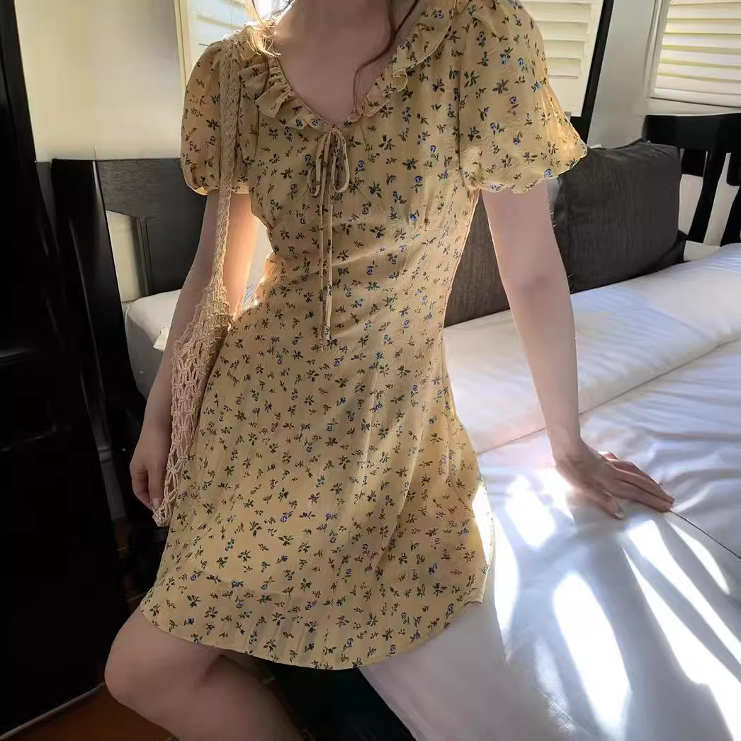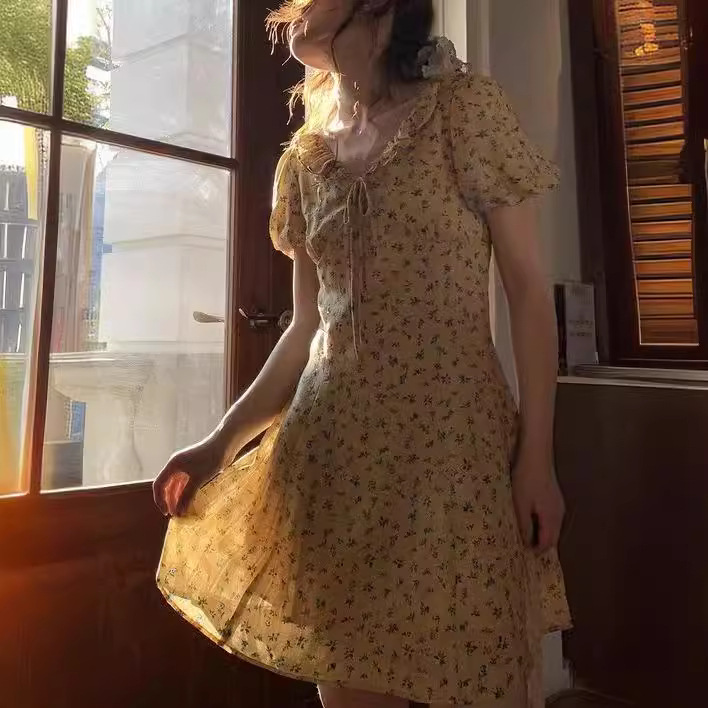 荷叶边V领绑带碎花连衣裙女年新款收腰中长款a字裙