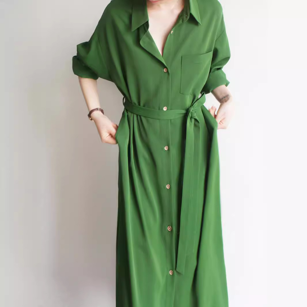 油画绿竖纹金属扣长袖系带衬衫过膝连衣裙两侧口袋通勤复古