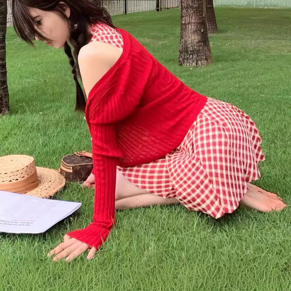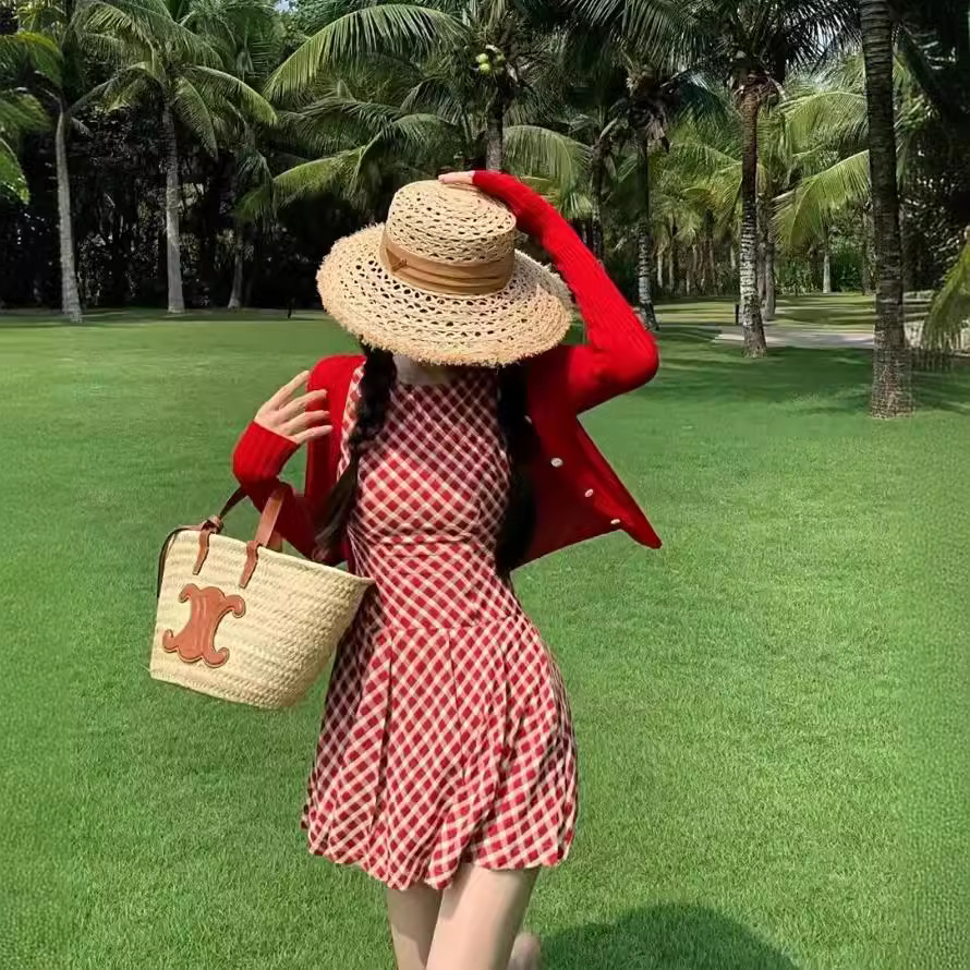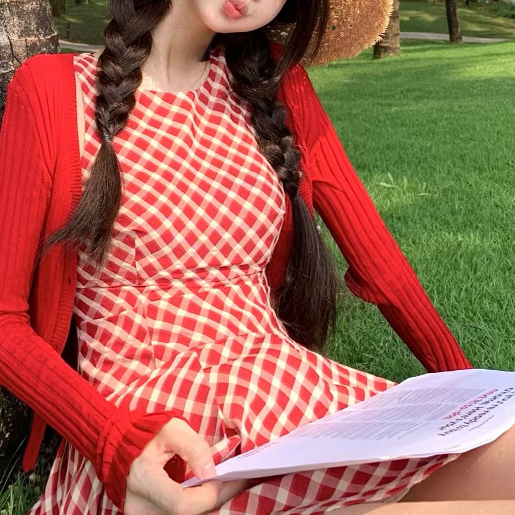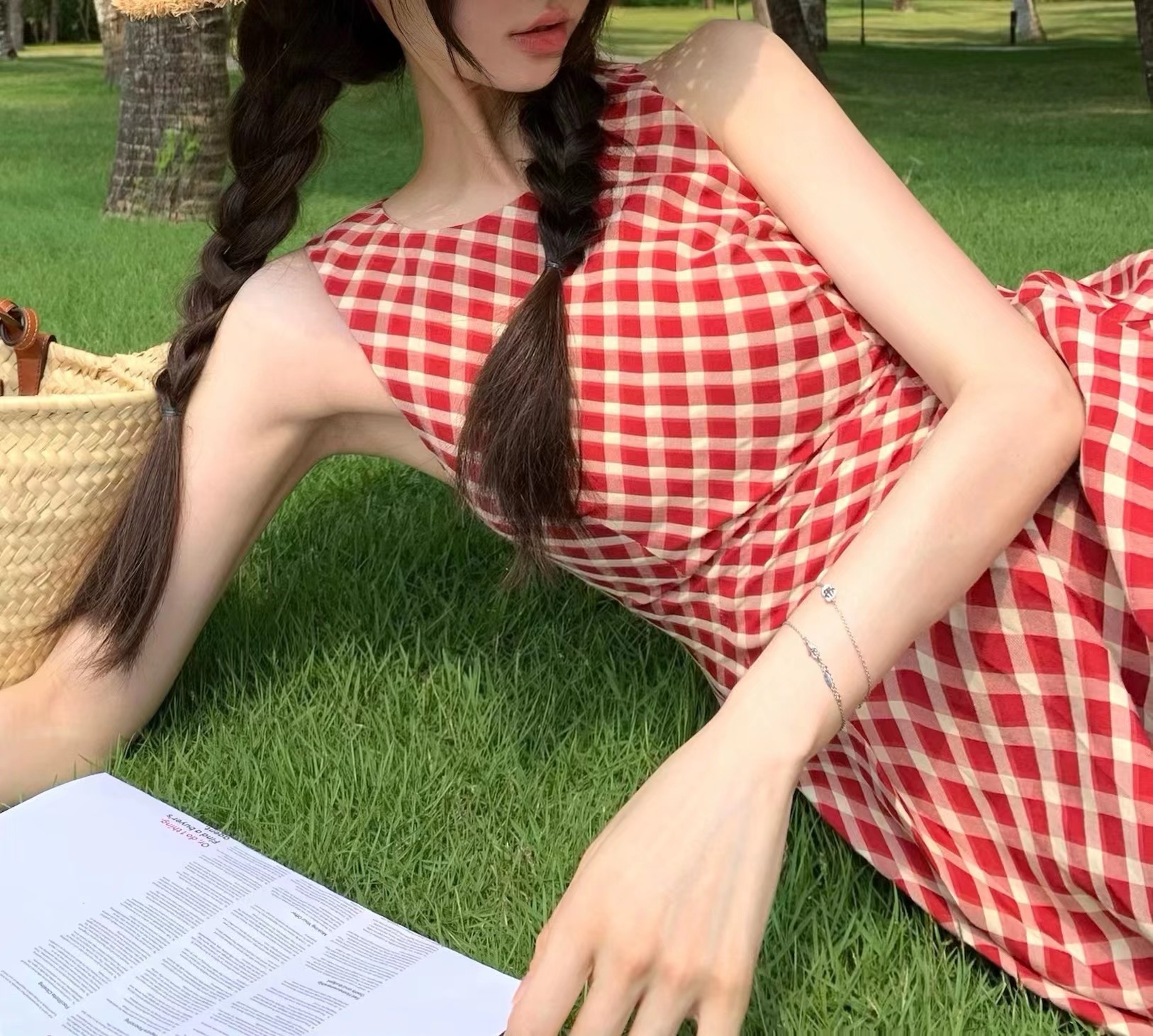 温柔无袖红色格子连衣裙女新款收腰显瘦背心短裙