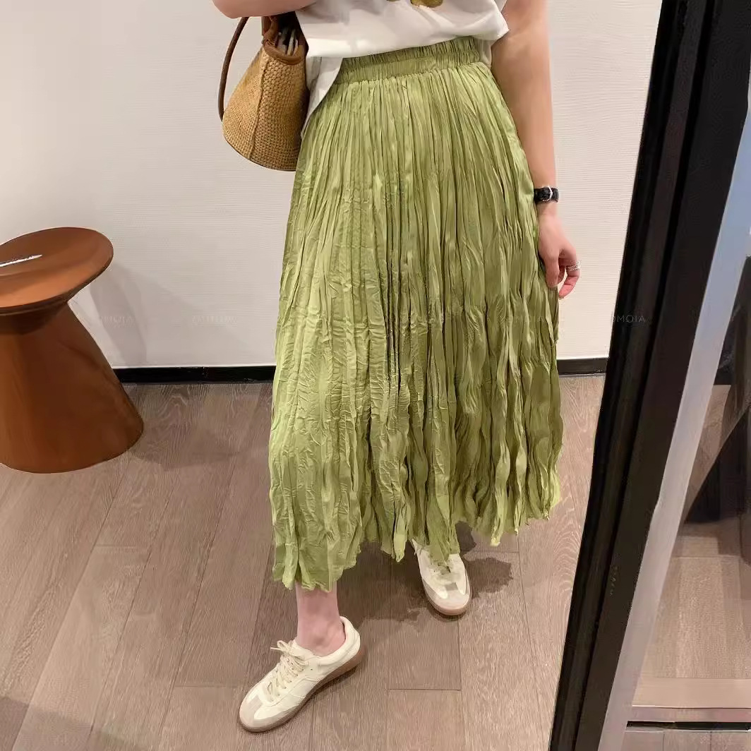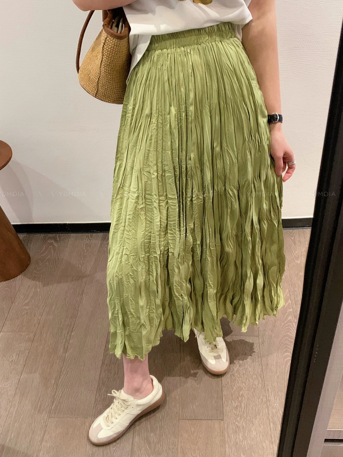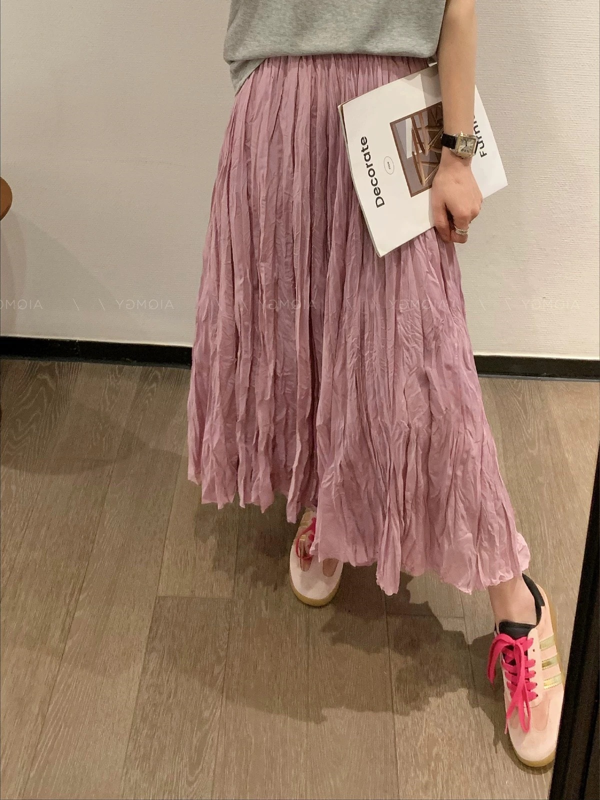 粉色褶皱半身裙女夏季新款设计感小清新高腰百褶显瘦a字长裙