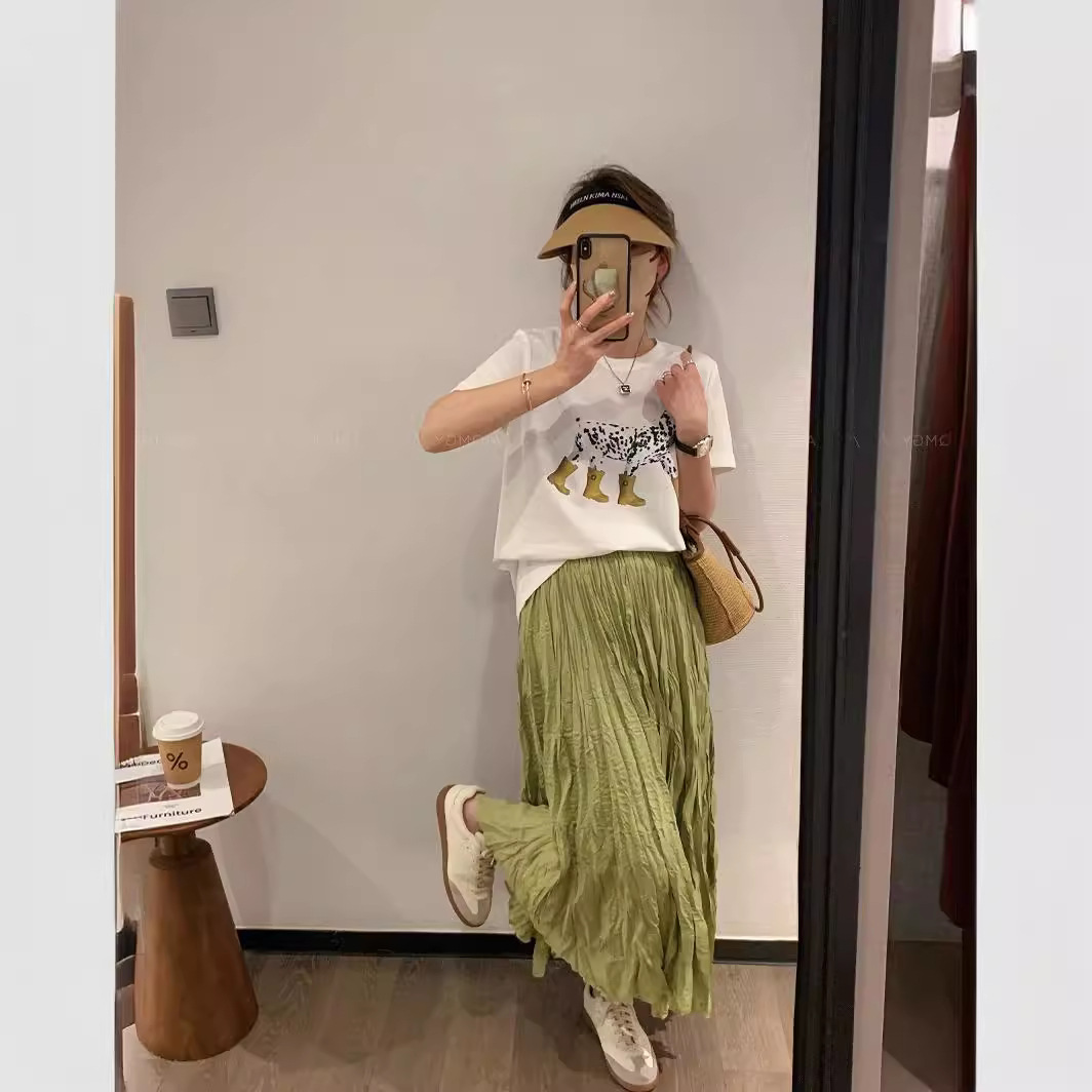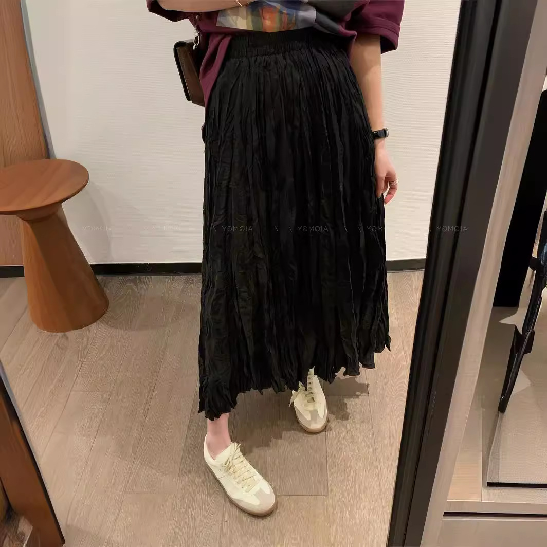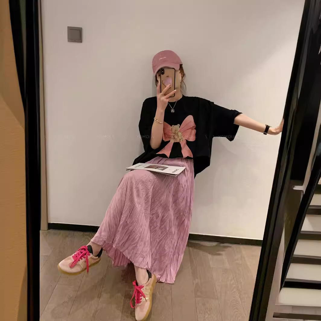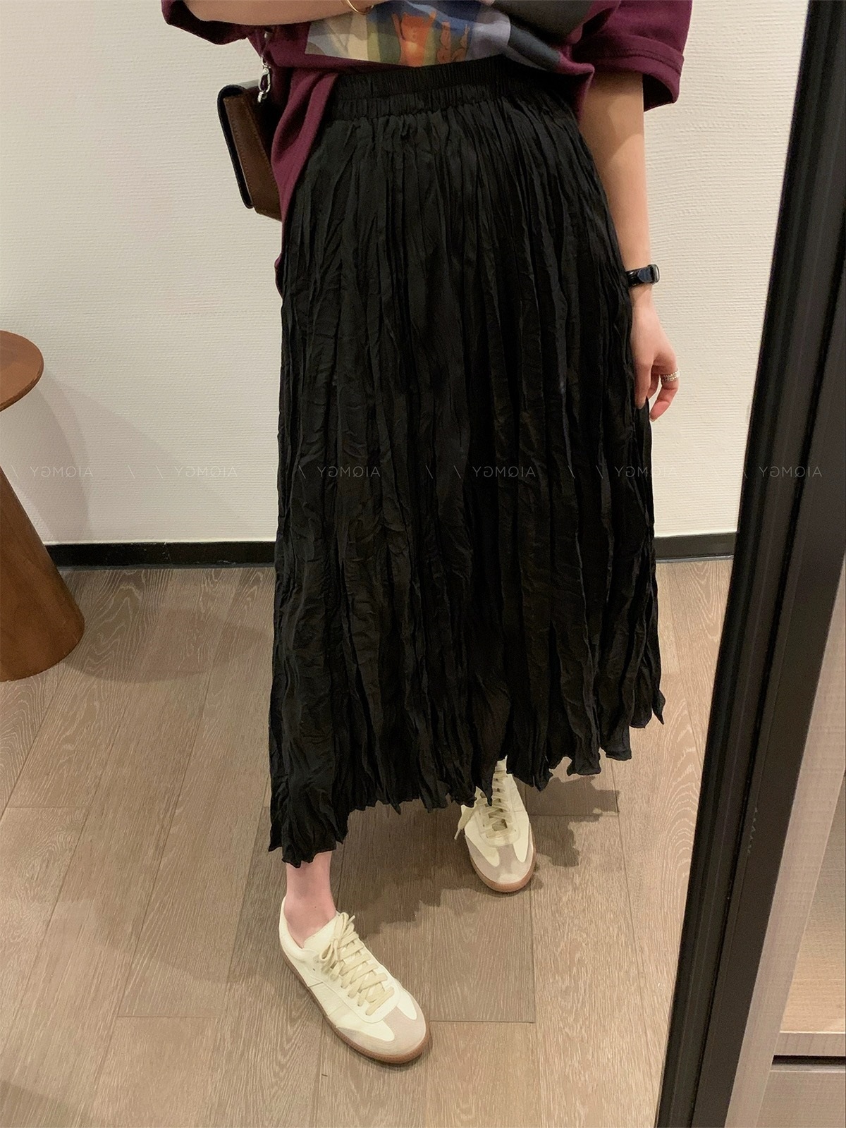 粉色褶皱半身裙女夏季新款设计感小清新高腰百褶显瘦a字长裙