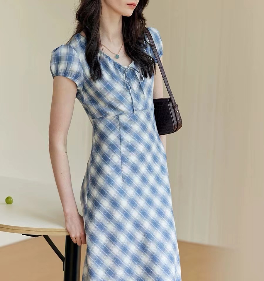 HeyDress法式V领格子连衣裙女夏季新款复古印花修身显瘦裙子