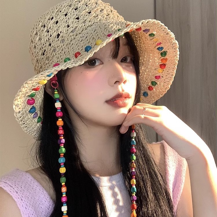 泫雅风彩色木珠草帽女夏季镂空大帽檐遮阳防晒帽可折叠渔夫帽子潮