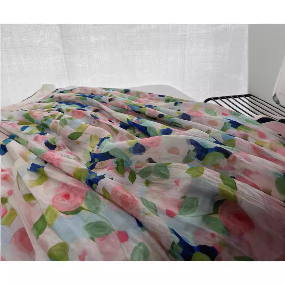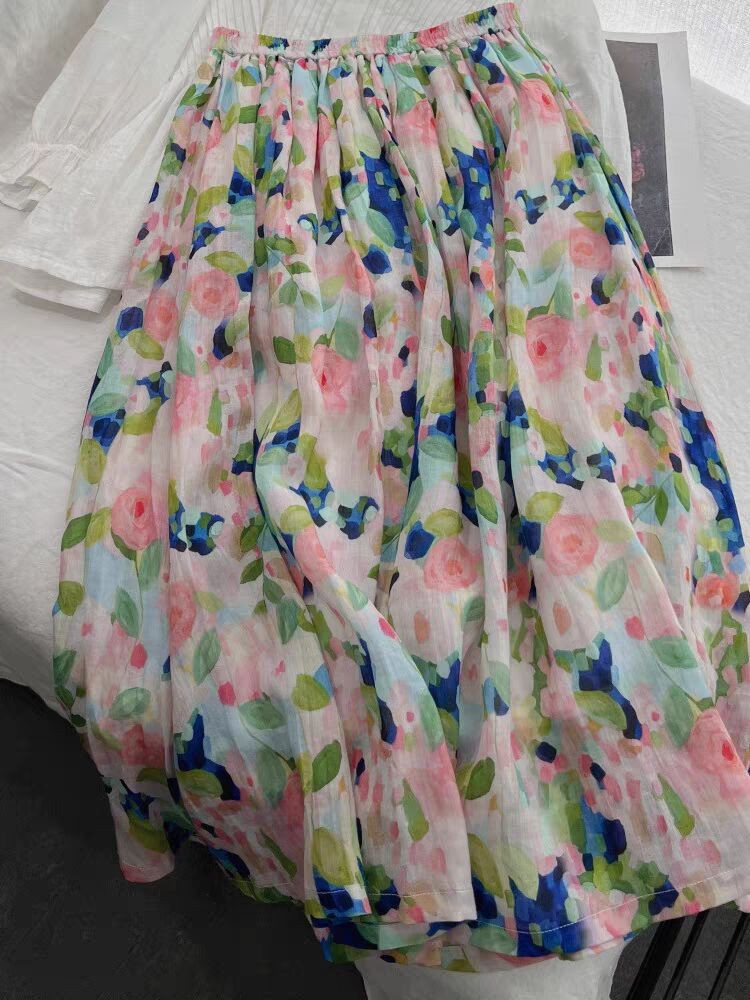 水彩桔梗花定染高支天然洞庭麻A字显瘦中长款半身裙夏