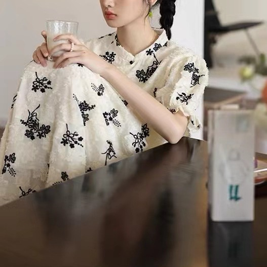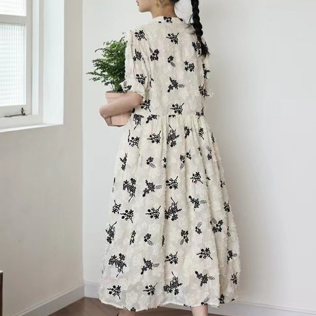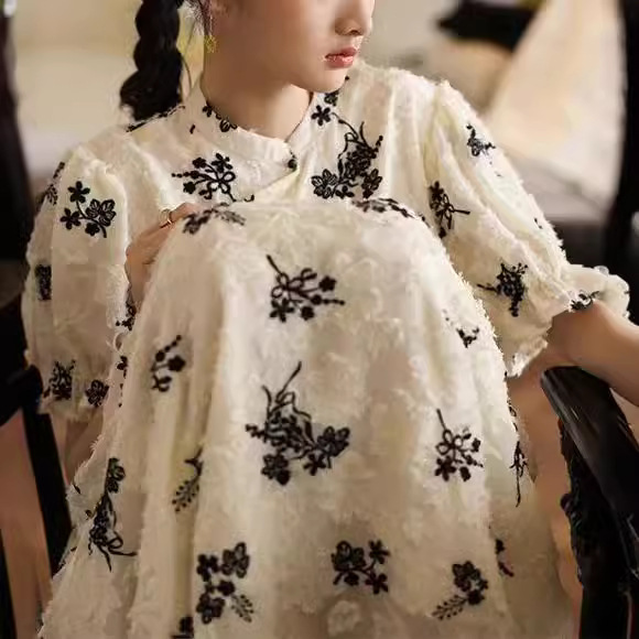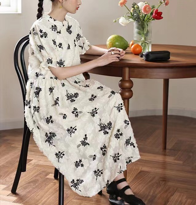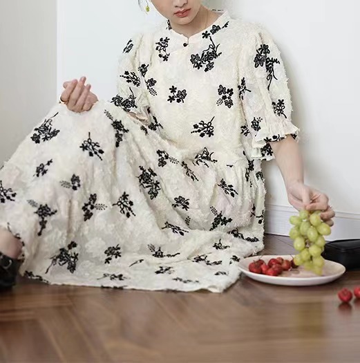 叙旧oldtimes新中式重工米色剪花绣花国风连衣裙夏A字裙长裙
