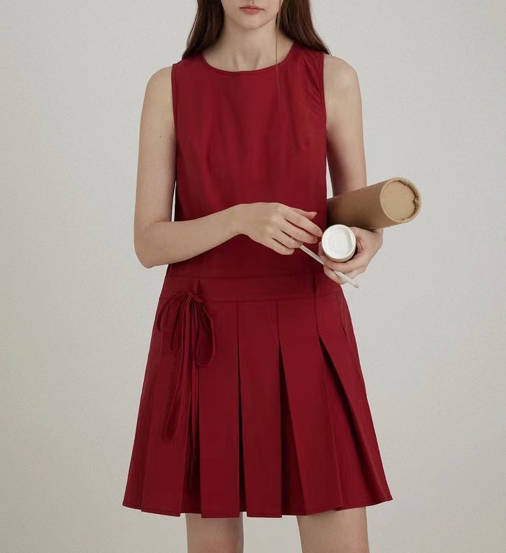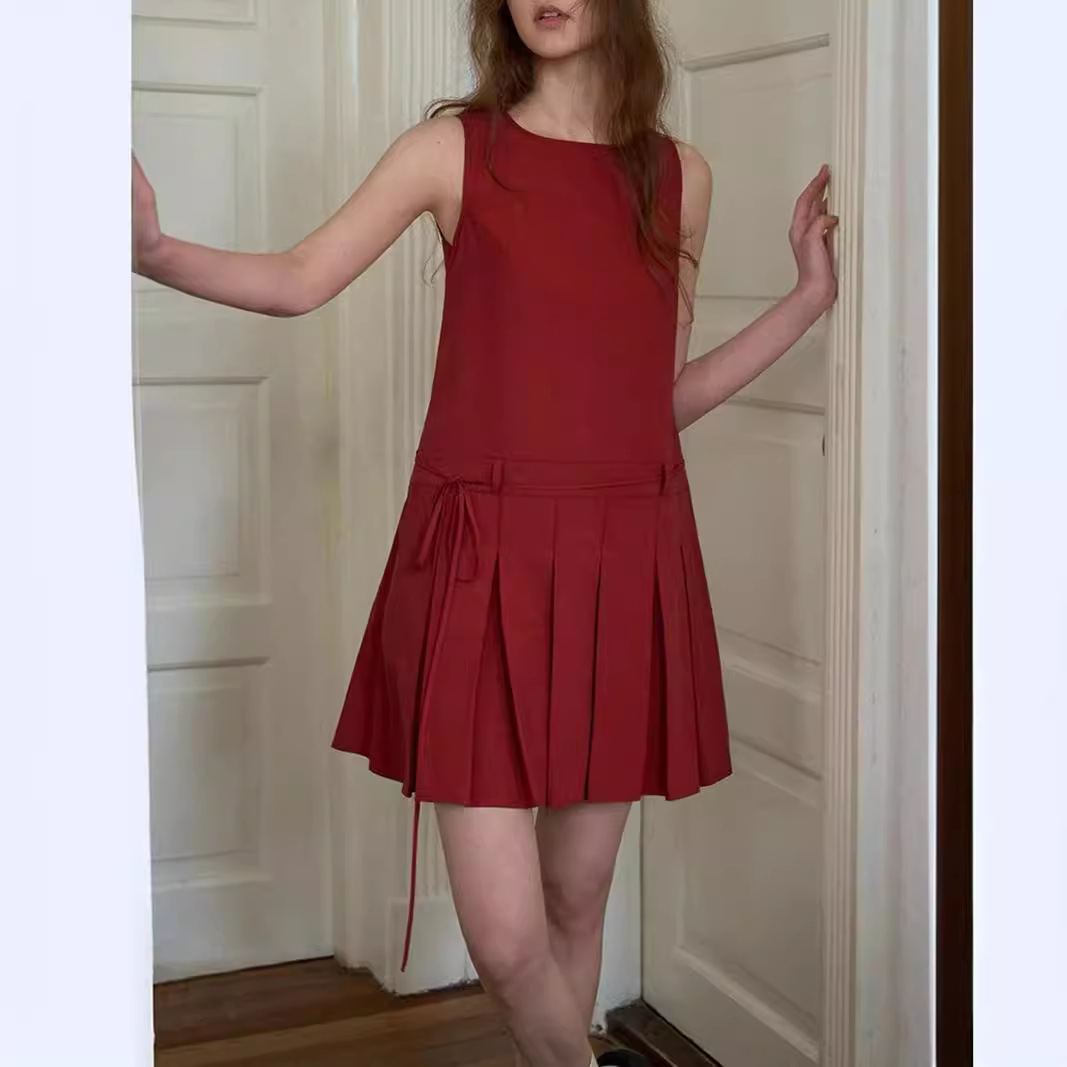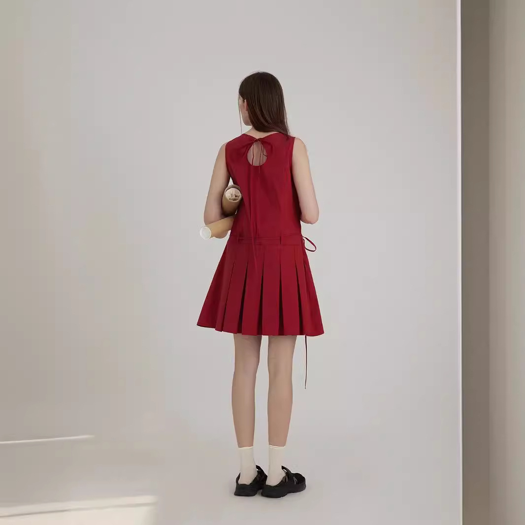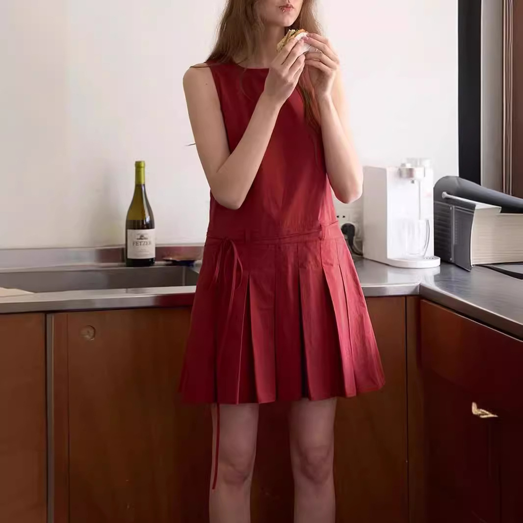 复古小红裙’夏季宽肩带后背镂空A字可系带百褶背心连衣裙