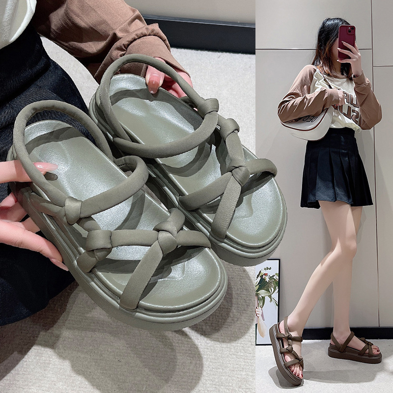 新款运动风凉鞋女松糕底休闲露趾凉鞋女厚底套脚打结罗马凉鞋女