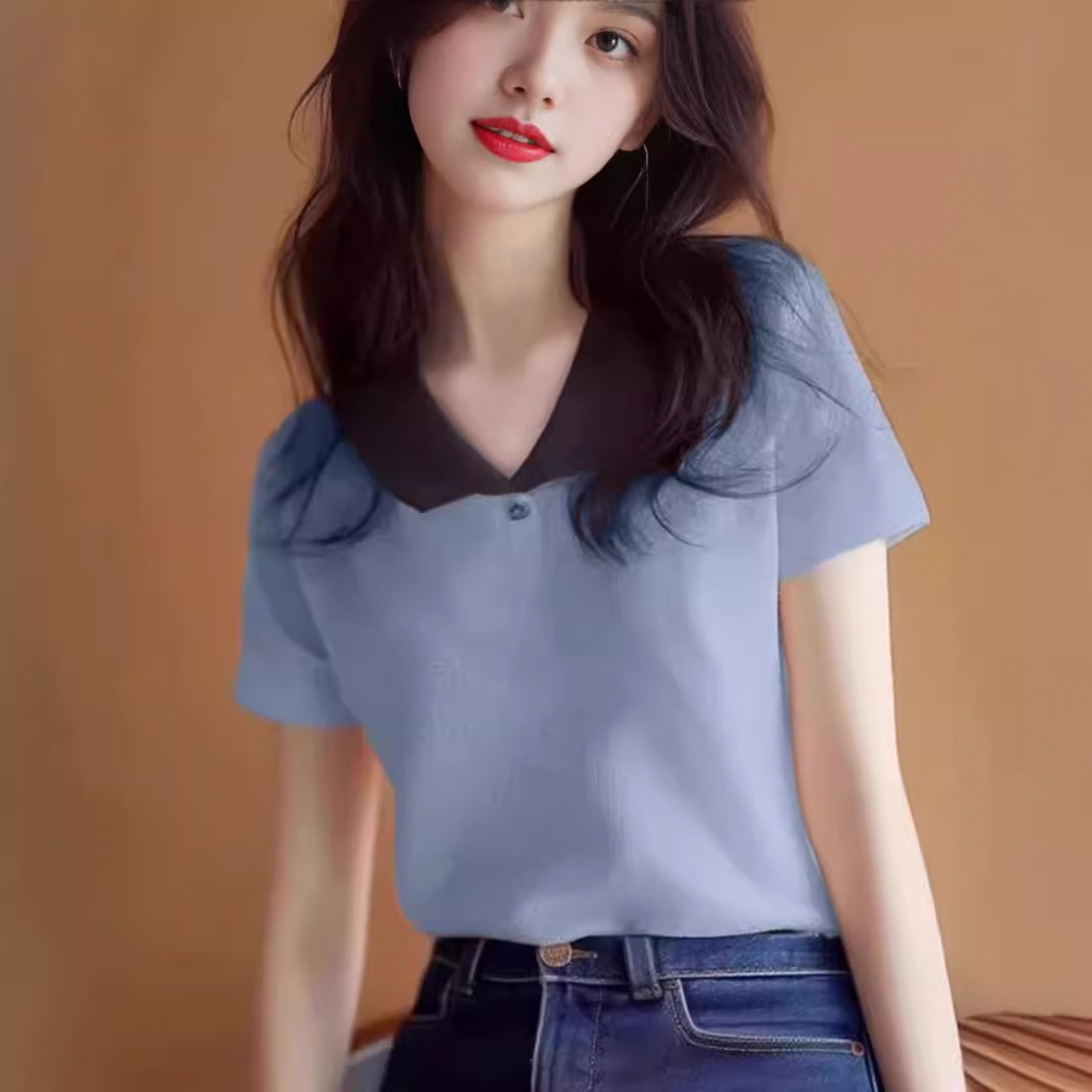 超级好看蓝色正肩短袖t恤女夏季新款时尚小个子独特漂亮上衣