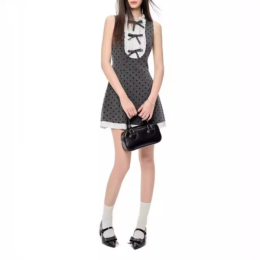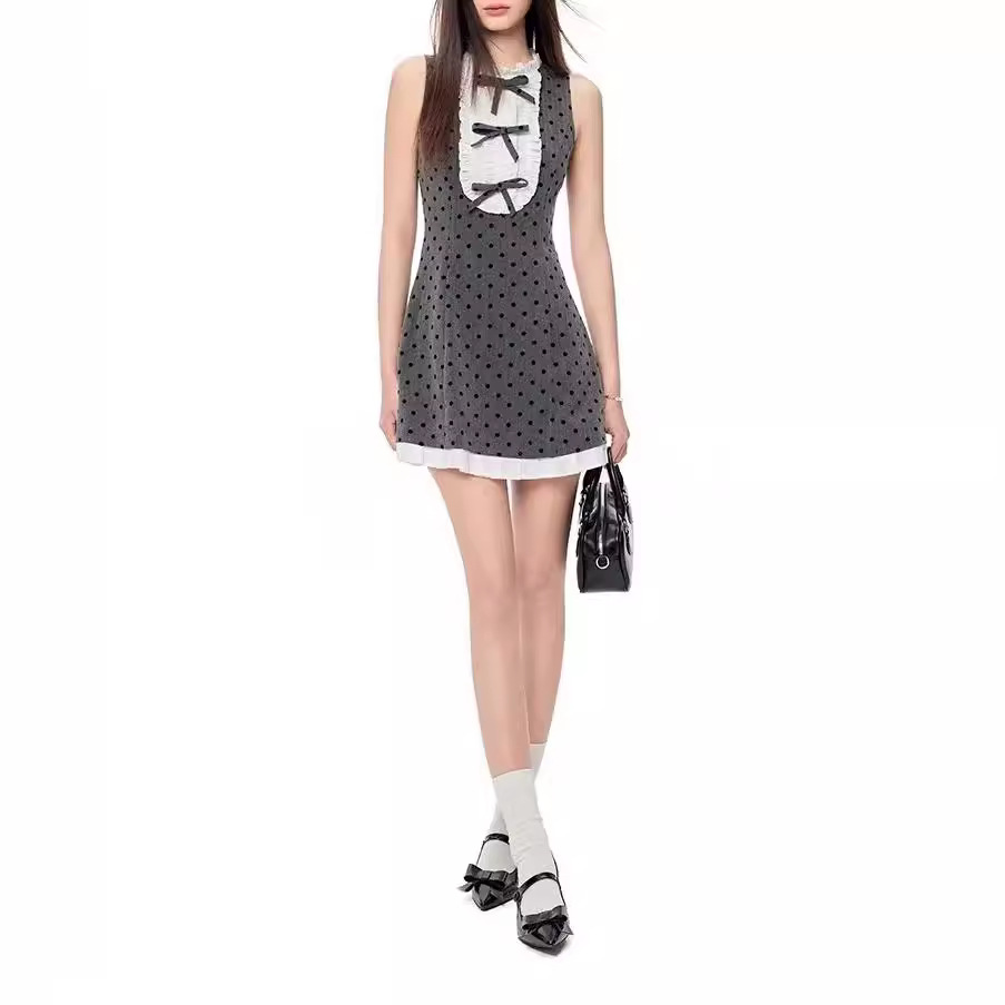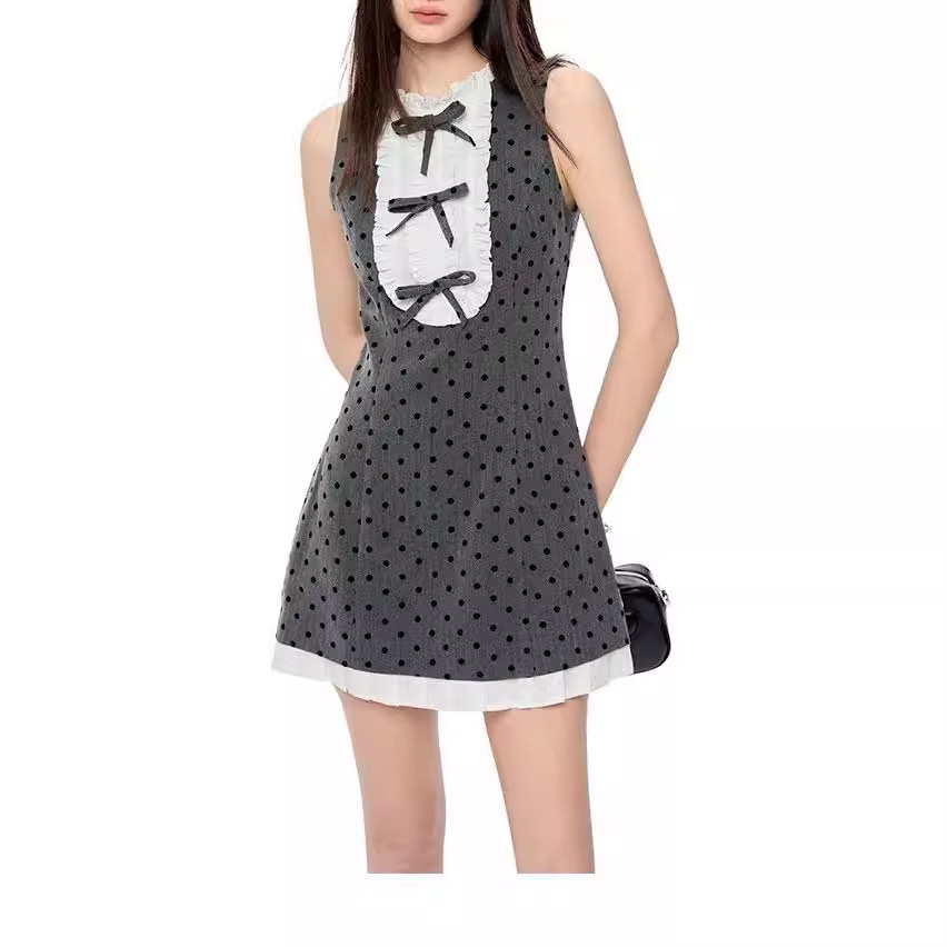 原创拼接木耳边抽皱连衣裙女灰色波点收腰显瘦蝴蝶结短裙