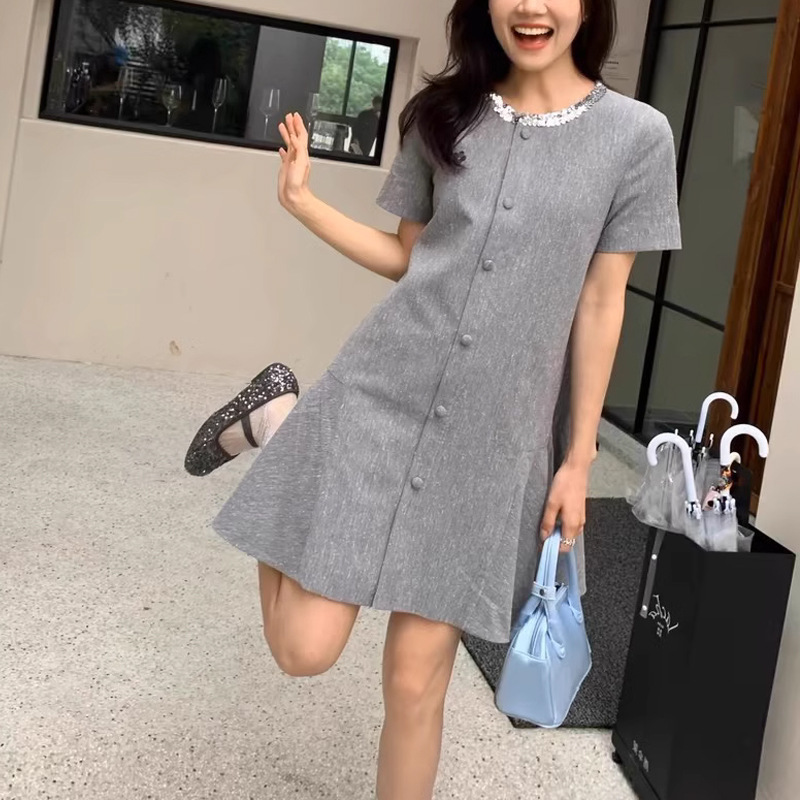名媛法式24/SS 高ji感气质真丝亚麻亮片领口设计小香风连衣裙女夏