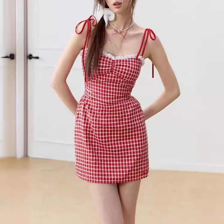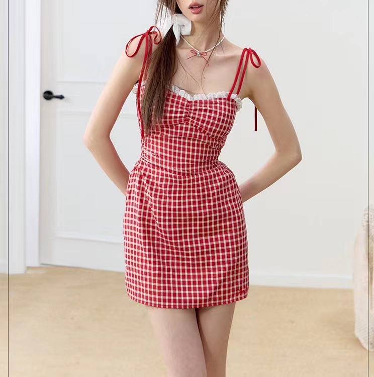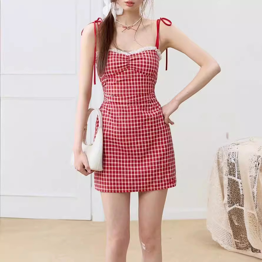 红色格纹吊带连衣裙女新款夏季甜美收腰系带裙子