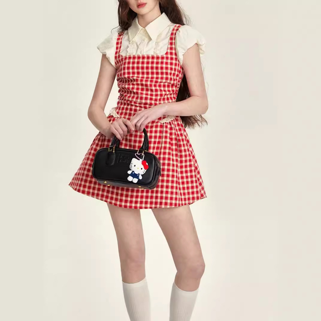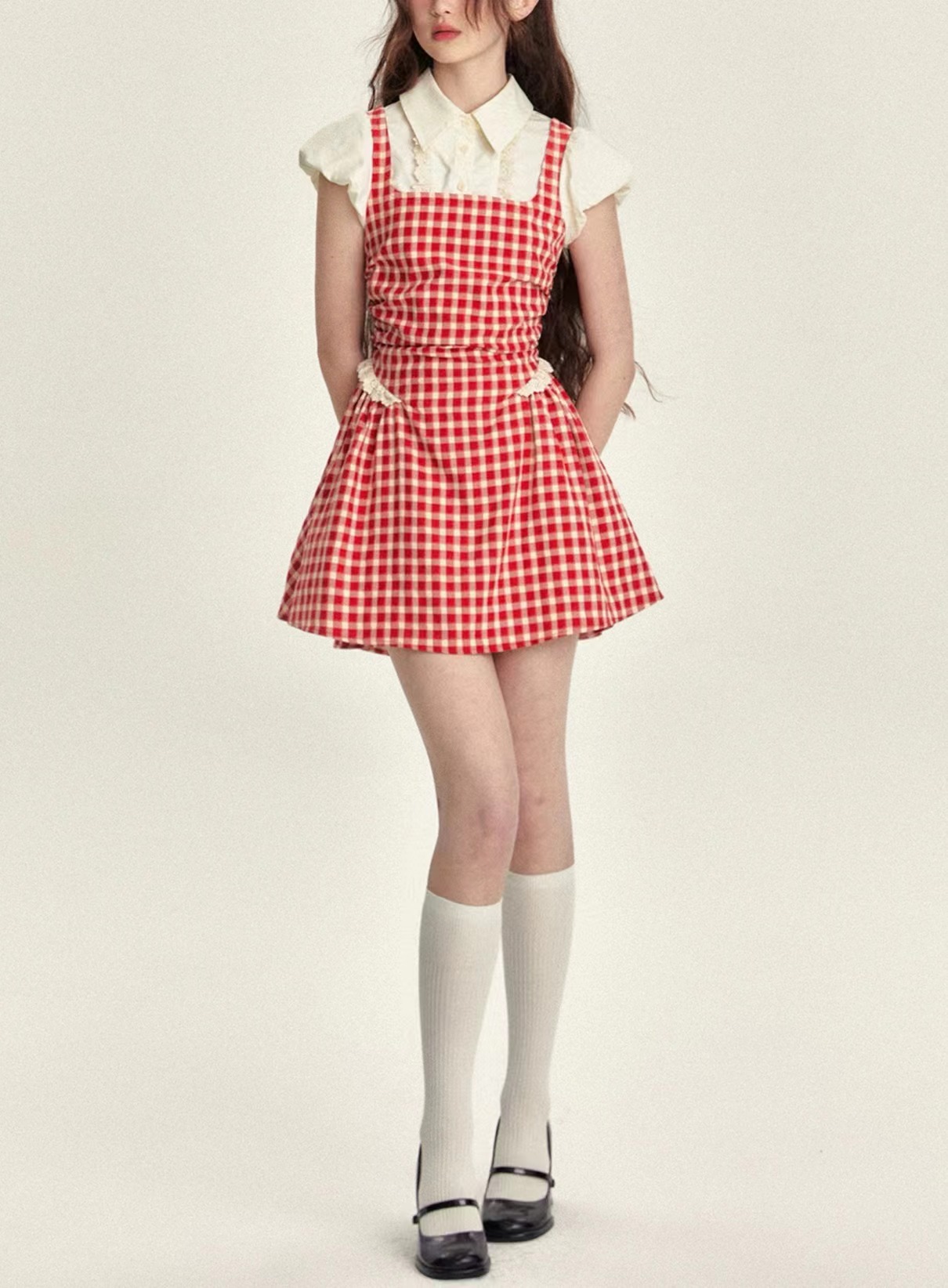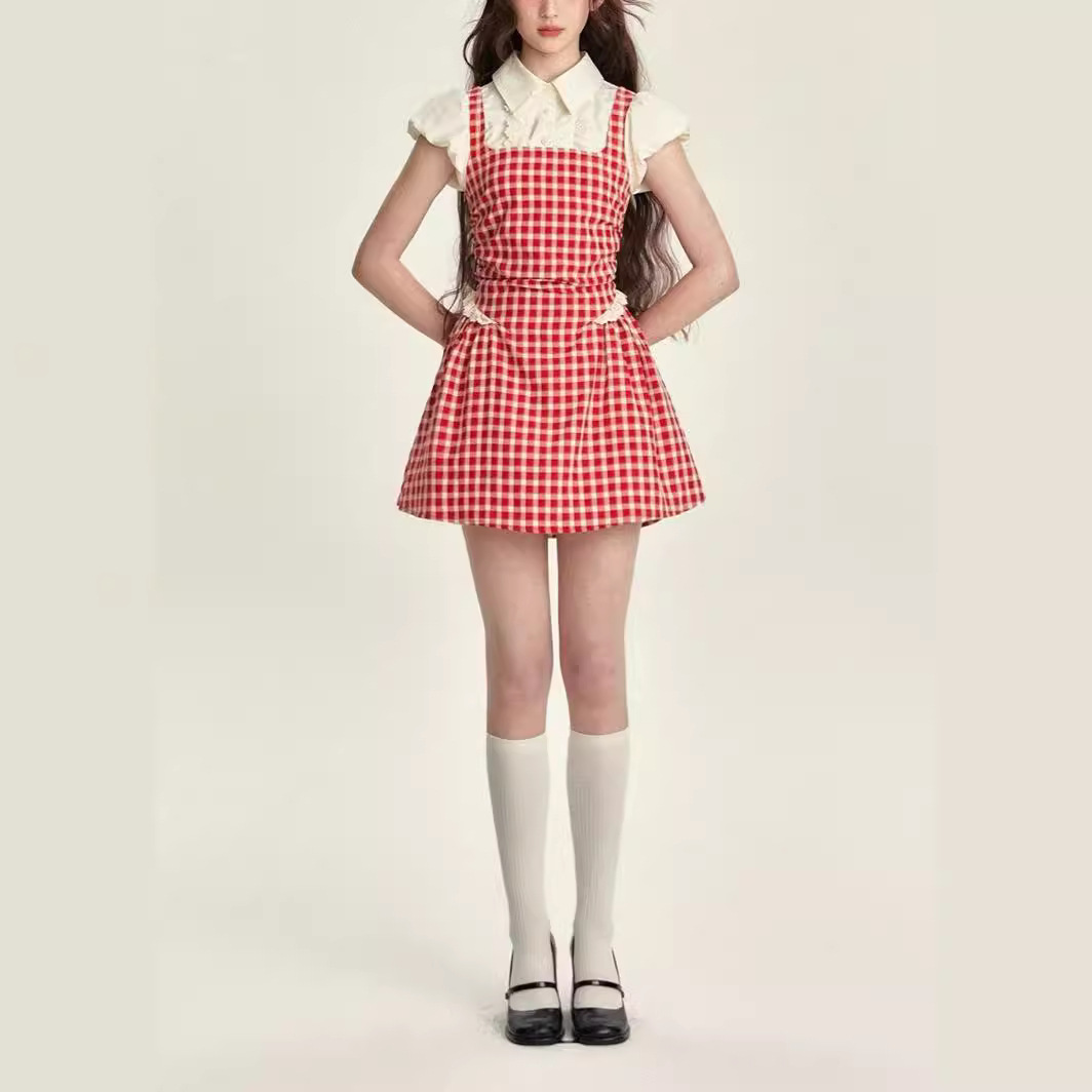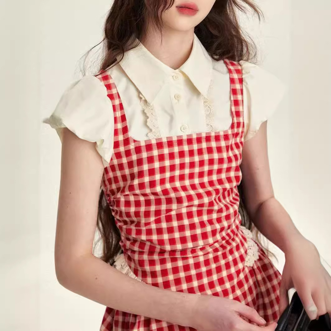 红格物语假两件格子连衣裙新款背带裙显瘦甜美衬衫裙
