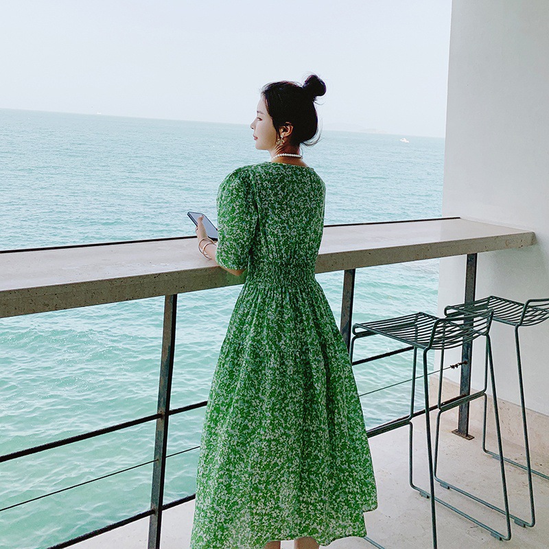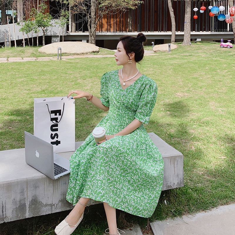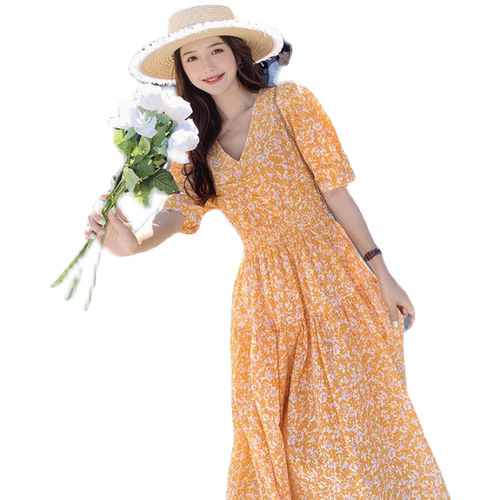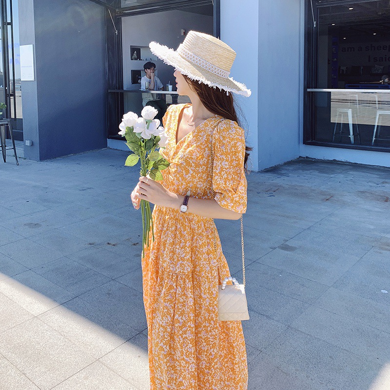甜美泡泡袖橘色裙子女夏季新款法式中长款v领碎花雪纺连衣裙